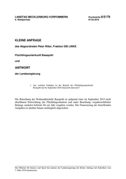 "content": "LANDTAG MECKLENBURG-VORPOMMERN Drucksache 6/5179 6. Wahlperiode 07.03.2016 KLEINE ANFRAGE des Abgeordneten Peter Ritter, Fraktion DIE LINKE Flüchtlingsunterkunft Basepohl und ANTWORT der Landesregierung 1. Aus welchen Gründen ist der Betrieb der Flüchtlingsunterkunft Basepohl nur bis September 2016 finanziell untersetzt? Die Betreibung der Wohnaußenstelle Basepohl ist aufgrund einer im September 2015 nicht absehbaren Entwicklung der Flüchtlingssituation und unter Beachtung vergaberechtlicher Belange zunächst befristet für ein Jahr vergeben worden. Die Finanzierung der betreffenden Aufgaben ist darüber hinaus umfänglich abgesichert. Der Minister für Inneres und Sport hat namens der Landesregierung die Kleine Anfrage mit Schreiben vom 7. März 2016 beantwortet.",