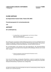 "content": "LANDTAG MECKLENBURG-VORPOMMERN Drucksache 7/3368 7. Wahlperiode 10.04.2019 KLEINE ANFRAGE des Abgeordneten Karsten Kolbe, Fraktion DIE LINKE Promotionsprogramm für Lehramtsstudierende und ANTWORT der Landesregierung 1. In welcher Phase ist das Landesprogramms zum Erwerb des Doktor- grades für Lehramtsstudierende? Wann werden die Promotionen voraussichtlich vorliegen? Die im Programm vorgesehenen acht Beschäftigungspositionen waren bis auf Didaktik Deutsch Lehramt an Regionalen Schulen und Gymnasien in Greifswald ausgeschrieben. Die noch aus- stehende Ausschreibung in Greifswald erfolgt dann, wenn die Professur besetzt ist. Die Auswahlverfahren sind insgesamt noch nicht abgeschlossen. Die Promotionsarbeiten werden in der Regel in drei Jahren ab dem Zeitpunkt der Beschäftigung, frühestens also im Jahr 2022, vorliegen. 2. Welche Forschungstitel werden Gegenstand der Promotionen sein bzw. sind Gegenstand der Promotionen? In der mit der Bewerbung vorzulegenden Projektskizze wurden die möglichen Forschungs- felder zumeist in erster Näherung skizziert. Dabei spielt durchweg der Bezug zum Unterrichts- hilfenportal Mecklenburg-Vorpommern eine wichtige Rolle. Die Ministerin für Bildung, Wissenschaft und Kultur hat namens der Landesregierung die Kleine Anfrage mit Schreiben vom 8. April 2019 beantwortet.",