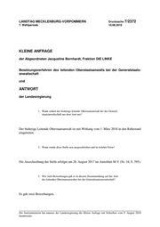 "content": "LANDTAG MECKLENBURG-VORPOMMERN Drucksache 7/2372 7. Wahlperiode 10.08.2018 KLEINE ANFRAGE der Abgeordneten Jacqueline Bernhardt, Fraktion DIE LINKE Besetzungsverfahren des leitenden Oberstaatsanwalts bei der Generalstaats- anwaltschaft und ANTWORT der Landesregierung 1. Wann schied der bisherige leitende Oberstaatsanwalt bei der General- staatsanwaltschaft aus dem Amt aus? Der bisherige Leitende Oberstaatsanwalt ist mit Wirkung vom 1. März 2018 in den Ruhestand eingetreten. 2. Wann wurde diese Stelle neu ausgeschrieben und in welcher Form? Die Ausschreibung der Stelle erfolgte am 28. August 2017 im Amtsblatt M-V (Nr. 34, S. 595). 3. Wie viele Bewerbungen gab es in diesem Zusammenhang auf das Amt des leitenden Oberstaatsanwaltes bei der Generalstaatsanwaltschaft? Es gab zwei Bewerbungen. Die Justizministerin hat namens der Landesregierung die Kleine Anfrage mit Schreiben vom 9. August 2018 beantwortet.",