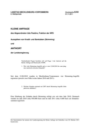 "content": "LANDTAG MECKLENBURG-VORPOMMERN Drucksache 6/44 6. Wahlperiode 01.11.2011 KLEINE ANFRAGE des Abgeordneten Udo Pastörs, Fraktion der NPD Ausspähen von Kredit- und Bankdaten (Skimming) und ANTWORT der Landesregierung Nachstehende Fragen beziehen sich auf Frage 1 der Antwort auf die Kleine Anfrage auf Drucksache 5/3698. 1. Wie viele Skimming-Angriffe gab es vom 12.08.2010 bis zum jüng- sten statistisch erfassten Zeitpunkt? Seit dem 12.08.2010 wurden in Mecklenburg-Vorpommern vier Skimming-Angriffe registriert (jeweils zwei Fälle in den Jahren 2010 und 2011). 2. Welcher Schaden entstand seit 2007 durch Skimming-Angriffe (bitte jahrweise abbilden)? Eine Erhebung der Schäden durch Skimming erfolgt erst seit dem Jahr 2010. Demnach wurden im Jahr 2010 zirka 950.000 Euro und im Jahr 2011 zirka 4.600 Euro als Schadens- summen registriert. Der Innenminister hat namens der Landesregierung die Kleine Anfrage mit Schreiben vom 28. Oktober 2011 beantwortet.",
