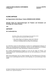 "content": "LANDTAG MECKLENBURG-VORPOMMERN Drucksache 6/3176 6. Wahlperiode 08.08.2014 KLEINE ANFRAGE der Abgeordneten Ulrike Berger, Fraktion BÜNDNIS 90/DIE GRÜNEN Aktueller Stand der Zielvereinbarungen mit Theatern und Orchestern auf Grundlage des Theater-Erlasses und ANTWORT der Landesregierung Die Kleine Anfrage steht in Zusammenhang mit den Antworten auf die Kleinen Anfragen auf den Drucksachen 6/2697 und 6/2898. 1. Mit welchen Theatern und Orchestern wurden bereits Zielverein- barungen auf Grundlage des aktuellen Theater-Erlasses geschlossen? Wie lautet der vollständige Inhalt der jeweiligen Zielvereinbarungen? Am 28.05.2014 wurde die Zielvereinbarung zwischen der Landeshauptstadt Schwerin als Trägerin des Mecklenburgischen Staatstheaters Schwerin und dem Ministerium für Bildung, Wissenschaft und Kultur des Landes Mecklenburg-Vorpommern geschlossen. Der Landkreis Mecklenburgische Seenplatte als einer der drei Träger der Theater- und Orchestergesellschaft Neubrandenburg/Neustrelitz hat die Zielvereinbarung am 25.07.2014 unterzeichnet. Beide Zielvereinbarungen sind als Anlagen beigefügt. Das Personalkonzept der Zielverein- barung mit der Landeshauptstadt Schwerin ist nicht beigefügt, da es personenbezogene Daten enthält. Der Minister für Bildung, Wissenschaft und Kultur hat namens der Landesregierung die Kleine Anfrage mit Schreiben vom 6. August 2014 beantwortet.",