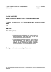 "content": "LANDTAG MECKLENBURG-VORPOMMERN Drucksache 7/4129 7. Wahlperiode 01.10.2019 KLEINE ANFRAGE des Abgeordneten Dr. Matthias Manthei, Fraktion Freie Wähler/BMV Förderung von Maßnahmen und Projekten gemäß § 96 Bundesvertriebenen- gesetz und ANTWORT der Landesregierung 1. Welche Fördersummen zu Maßnahmen und Projekten gemäß § 96 Bundesvertriebenengesetz wurden in den Jahren 2018 und 2019 gewährt (bitte jeweils nach Jahren aufschlüsseln)? 2. Welche Maßnahmen, Projekte und Institutionen wurden gemäß § 96 Bundesvertriebenengesetz in den Jahren 2018 und 2019 gefördert (bitte Jahr, Titel der Maßnahme oder des Projektes, Zuwendungs- empfänger, Dauer des Projektes oder der Maßnahme, Fördersumme und Höhe des Eigenanteils des Zuwendungsempfängers angeben)? Die Fragen 1 und 2 werden zusammenhängend beantwortet. Die Justizministerin hat namens der Landesregierung die Kleine Anfrage mit Schreiben vom 30. September 2019 beantwortet.",