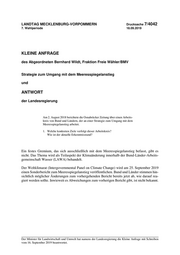 "content": "LANDTAG MECKLENBURG-VORPOMMERN Drucksache 7/4042 7. Wahlperiode 18.09.2019 KLEINE ANFRAGE des Abgeordneten Bernhard Wildt, Fraktion Freie Wähler/BMV Strategie zum Umgang mit dem Meeresspiegelanstieg und ANTWORT der Landesregierung Am 2. August 2018 berichtete die Osnabrücker Zeitung über einen Arbeits- kreis von Bund und Ländern, der an einer Strategie zum Umgang mit dem Meeresspiegelanstieg arbeitet. 1. Welche konkreten Ziele verfolgt dieser Arbeitskreis? Wie ist der aktuelle Erkenntnisstand? Ein festes Gremium, das sich ausschließlich mit dem Meeresspiegelanstieg befasst, gibt es nicht. Das Thema wird als Teilaspekt der Klimaänderung innerhalb der Bund-Länder-Arbeits- gemeinschaft Wasser (LAWA) behandelt. Der Weltklimarat (Intergovernmental Panel on Climate Change) wird am 25. September 2019 einen Sonderbericht zum Meeresspiegelanstieg veröffentlichen. Bund und Länder stimmen hin- sichtlich möglicher Änderungen zum vorhergehenden Bericht bereits jetzt ab, wie darauf rea- giert werden sollte. Inwieweit es Abweichungen zum vorherigen Bericht gibt, ist nicht bekannt. Der Minister für Landwirtschaft und Umwelt hat namens der Landesregierung die Kleine Anfrage mit Schreiben vom 16. September 2019 beantwortet.",