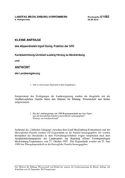"content": "LANDTAG MECKLENBURG-VORPOMMERN Drucksache 6/1062 6. Wahlperiode 20.09.2012 KLEINE ANFRAGE des Abgeordneten Ingulf Donig, Fraktion der SPD Kunstsammlung Christian Ludwig Herzog zu Mecklenburg und ANTWORT der Landesregierung 1. Gibt es einen neuen Sachstand in den Gesprächen? Entsprechend den Festlegungen der Landesregierung wurden die Gespräche mit der Großherzoglichen Familie durch den Minister für Bildung, Wissenschaft und Kultur aufgenommen. 2. Hat die Landesregierung seit 1990 Kunstgegenstände aus dem Eigen- tum der herzoglichen Familie in deren Besitz zurückgegeben? Wenn ja, aus welchem Grund? Aufgrund der „Gütlichen Einigung“ zwischen dem Land Mecklenburg-Vorpommern und der Herzoglichen Familie wurden 152 Gegenstände an die Familie herausgegeben. Sie wurden Bestandteil des Bescheides in dem Verwaltungsverfahren wegen Ansprüchen nach dem Ausgleichsleistungsgesetz des Landesamtes zur Regelung offener Vermögensfragen Mecklenburg-Vorpommern vom 27. Oktober 1997. Die Gegenstände wurden am 22. Juni 1998 laut Übergabeprotokoll an die Herzogliche Familie herausgegeben. Der Minister für Bildung, Wissenschaft und Kultur hat namens der Landesregierung die Kleine Anfrage mit Schreiben vom 19. September 2012 beantwortet.",