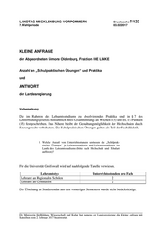 "content": "LANDTAG MECKLENBURG-VORPOMMERN Drucksache 7/123 7. Wahlperiode 03.02.2017 KLEINE ANFRAGE der Abgeordneten Simone Oldenburg, Fraktion DIE LINKE Anzahl an „Schulpraktischen Übungen“ und Praktika und ANTWORT der Landesregierung Vorbemerkung Die im Rahmen des Lehramtsstudiums zu absolvierenden Praktika sind in § 7 des Lehrerbildungsgesetzes hinsichtlich ihres Gesamtumfangs an Wochen (15) und ECTS-Punkten (15) festgeschrieben. Das Nähere bleibt der Gestaltungsmöglichkeit der Hochschulen durch Satzungsrecht vorbehalten. Die Schulpraktischen Übungen gelten als Teil der Fachdidaktik. 1. Welche Anzahl von Unterrichtsstunden umfassen die „Schulprak- tischen Übungen“ je Lehramtsstudentin und Lehramtsstudenten im Laufe des Lehramtsstudiums (bitte nach Hochschule und Schulart auflisten)? Für die Universität Greifswald wird auf nachfolgende Tabelle verwiesen. Lehramtstyp Unterrichtsstunden pro Fach Lehramt an Regionalen Schulen 2 Lehramt an Gymnasien 2 Der Überhang an Studierenden aus den vorherigen Semestern wurde nicht berücksichtigt. Die Ministerin für Bildung, Wissenschaft und Kultur hat namens der Landesregierung die Kleine Anfrage mit Schreiben vom 2. Februar 2017 beantwortet.",