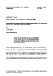 "content": "LANDTAG MECKLENBURG-VORPOMMERN Drucksache 7/2931 7. Wahlperiode 12.02.2019 KLEINE ANFRAGE der Abgeordneten Simone Oldenburg, Fraktion DIE LINKE Besetzungen der Funktionsstellen an den allgemeinbildenden und beruflichen Schulen des Landes Mecklenburg-Vorpommern und ANTWORT der Landesregierung 1. Welche Anzahl von Funktionsstellen an den öffentlichen allgemein- bildenden und beruflichen Schulen des Landes ist gegenwärtig nicht oder nur amtierend besetzt (bitte nach Schularten und Schulamts- bereichen getrennt angeben; für angeführte amtierend besetzte Stellen bitte das Schuljahr und den Zeitraum, seit dem diese Stellen amtierend besetzt worden sind, angeben)? Die nachfolgende Darstellung bezieht sich ausschließlich auf die Stellen für Schulleitungen. Gemäß § 101 Absatz 1 Schulgesetz hat jede Schule eine Schulleiterin oder einen Schulleiter und eine stellvertretende Schulleiterin oder einen stellvertretenden Schulleiter. Mit Erfassungs- datum 3. Dezember 2018 liegen 46 tatsächlich vorübergehend besetzte Leitungsstellen vor. In einer Reihe von Fällen liegt bereits mindestens eine Bewerbung auf die jeweils entsprechende Ausschreibung vor. Diese Auswahlverfahren laufen, sind jedoch noch nicht abgeschlossen. Alle nachfolgend genannten Leitungsstellen sind im laufenden Besetzungsverfahren durch Stellvertreterinnen und Stellvertreter beziehungsweise durch Lehrkräfte kommissarisch besetzt. Die Ministerin für Bildung, Wissenschaft und Kultur hat namens der Landesregierung die Kleine Anfrage mit Schreiben vom 11. Februar 2019 beantwortet.",