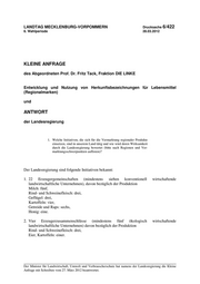 "content": "LANDTAG MECKLENBURG-VORPOMMERN Drucksache 6/422 6. Wahlperiode 28.03.2012 KLEINE ANFRAGE des Abgeordneten Prof. Dr. Fritz Tack, Fraktion DIE LINKE Entwicklung und Nutzung von Herkunftsbezeichnungen für Lebensmittel (Regionalmarken) und ANTWORT der Landesregierung 1. Welche Initiativen, die sich für die Vermarktung regionaler Produkte einsetzen, sind in unserem Land tätig und wie wird deren Wirksamkeit durch die Landesregierung bewertet (bitte nach Regionen und Ver- marktungsschwerpunkten auflisten)? Der Landesregierung sind folgende Initiativen bekannt: 1. 22 Erzeugergemeinschaften (mindestens sieben konventionell wirtschaftende landwirtschaftliche Unternehmen), davon bezüglich der Produktion Milch: fünf, Rind- und Schweinefleisch: drei, Geflügel: drei, Kartoffeln: vier, Getreide und Raps: sechs, Honig: eine. 2. Vier Erzeugerzusammenschlüsse (mindestens fünf ökologisch wirtschaftende landwirtschaftliche Unternehmen) davon bezüglich der Produktion Rind- und Schweinefleisch: drei, Eier, Kartoffeln: einer. Der Minister für Landwirtschaft, Umwelt und Verbrauscherschutz hat namens der Landesregierung die Kleine Anfrage mit Schreiben vom 27. März 2012 beantwortet.",