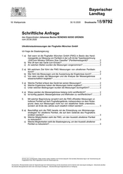 "content": "18. Wahlperiode \b 30.10.2020 Drucksache 18/9792 Schriftliche Anfrage des Abgeordneten Johannes Becher BÜNDNIS 90/DIE GRÜNEN vom 25.08.2020 Ultrafeinstaubmessungen der Flughafen München GmbH Ich frage die Staatsregierung: 1. a) Seit wann ist die Flughafen München GmbH (FMG) in Besitz des Hand- messgeräts zur Messung von Partikeln in der Luft mit der Typenbezeichnung „DiSCmini Miniatur Diffusion Size Classifier“ (Partikelmessgerät)?.................... 2 b) Wie oft kam das Gerät zum Einsatz?................................................................... 2 c) An welchen Stellen wurden die Messungen vorgenommen?.............................. 2 2. a) Mit welchem Ziel führt die FMG Messungen von ultrafeinen Partikeln durch?.................................................................................................................. 2 b) Wer führt die Messungen und die Auswertung der Ergebnisse durch?............... 2 c) Von wem wurden die Messungen und die Analyse der Messergebnisse wissenschaftlich begleitet?.................................................................................. 2 3. a) Welche Partikel erfasst das Gerät bei seinen Messungen?................................ 2 b) Welche Ergebnisse haben die Messungen bisher ergeben?............................... 2 c) Unter welchen Bedingungen wurden die Messungen durchgeführt?.................. 2 4. a) Wieso werden die Messergebnisse bislang nicht veröffentlicht?........................ 2 b) Ist künftig geplant, Messergebnisse und Methoden zu veröffentlichen?............. 2 5.\t\t Mit welcher Begründung verwehrt sich die FMG offiziellen Messungen ul- trafeiner Partikel auf dem Flughafengelände, insbesondere vor dem Hinter- grund, dass nun Messungen nicht nur von staatlicher Seite unterstützt, sondern ab Ende des Jahres auch staatlich initiiert werden?.............................. 3 6. a) Beschäftigt sich die FMG bereits mit der Entwicklung von Minimierungs- strategien für ultrafeine Partikel, die auf dem Gelände des Flughafens emittiert werden?.................................................................................................. 3 b) Welche Möglichkeiten sieht die FMG, um den Ausstoß ultrafeiner Partikel zu reduzieren?...................................................................................................... 3 c) Welche Möglichkeiten sieht die Staatsregierung, um den Ausstoß ultrafeiner Partikel zu reduzieren?......................................................................................... 3 Hinweis des Landtagsamts: Zitate werden weder inhaltlich noch formal überprüft. Die korrekte Zitierweise liegt in der Verantwortung der Fragestellerin bzw. des Fragestellers sowie der Staatsregierung. Drucksachen, Plenarprotokolle sowie die Tagesordnungen der Vollversammlung und der Ausschüsse sind im Internet unter www.bayern.landtag.de – Dokumente abrufbar. Die aktuelle Sitzungsübersicht steht unter www.bayern.landtag.de – Aktuelles/Sitzungen/Tagesübersicht zur Verfügung.",