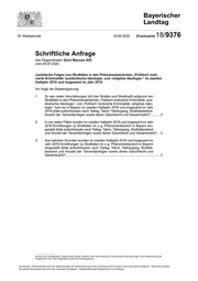 "content": "18. Wahlperiode \b 18.08.2020 Drucksache 18/9376 Schriftliche Anfrage des Abgeordneten Gerd Mannes AfD vom 09.07.2020 Juristische Folgen von Straftaten in den Phänomenbereichen „Politisch moti- vierte Kriminalität -ausländische Ideologie- und -religiöse Ideologie-“ im zweiten Halbjahr 2019 und insgesamt im Jahr 2019 Ich frage die Staatsregierung: 1.\t\t Zu wie vielen Verurteilungen (Art der Strafen und Strafmaß) aufgrund von Straftaten in den Phänomenbereichen „Politisch motivierte Kriminalität -aus- ländische Ideologie-“ und „Politisch motivierte Kriminalität -religiöse Ideo- logie-“ kam es in Bayern im zweiten Halbjahr 2019 und insgesamt im Jahr 2019 (bitte aufschlüsseln nach Tattag, Tatort, Tathergang, Straftatbestand, Anzahl der Tatverdächtigen sowie deren Geschlecht und Gesamtzahl)?........... 2 2.\t\t In wie vielen Fällen wurden im zweiten Halbjahr 2019 und insgesamt im Jahr 2019 Ermittlungen zu Straftaten im o. g. Phänomenbereich in Bayern ein- gestellt (bitte aufschlüsseln nach Tattag, Tatort, Tathergang, Straftatbestand und Anzahl der Tatverdächtigen sowie deren Geschlecht und Gesamtzahl)?.... 2 3.\t\t Aus welchen Gründen wurden im zweiten Halbjahr 2019 und insgesamt im Jahr 2019 Ermittlungen zu Straftaten im o. g. Phänomenbereich in Bayern eingestellt (bitte aufschlüsseln nach Tattag, Tatort, Tathergang, Straftat- bestand und Anzahl der Tatverdächtigen sowie deren Geschlecht und Gesamtzahl)?....................................................................................................... 2 Hinweis des Landtagsamts: Zitate werden weder inhaltlich noch formal überprüft. Die korrekte Zitierweise liegt in der Verantwortung der Fragestellerin bzw. des Fragestellers sowie der Staatsregierung. Drucksachen, Plenarprotokolle sowie die Tagesordnungen der Vollversammlung und der Ausschüsse sind im Internet unter www.bayern.landtag.de – Dokumente abrufbar. Die aktuelle Sitzungsübersicht steht unter www.bayern.landtag.de – Aktuelles/Sitzungen/Tagesübersicht zur Verfügung.",