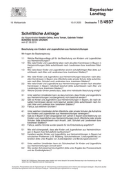 "content": "18. Wahlperiode\b 10.01.2020 Drucksache 18/4937 Schriftliche Anfrage der Abgeordneten Kerstin Celina, Anna Toman, Gabriele Triebel BÜNDNIS 90/DIE GRÜNEN vom 27.09.2019 Beschulung von Kindern und Jugendlichen aus Heimeinrichtungen Wir fragen die Staatsregierung: 1.1 Welche Rechtsgrundlage gilt für die Beschulung von Kindern und Jugendlichen aus Heimeinrichtungen? 1.2 Wie viele Kinder und Jugendliche leben nach aktuellen Kenntnissen in Bayern in Heimeinrichtungen (bitte aufschlüsseln nach Landkreisen bzw. kreisfreien Städ- ten)? 1.3 Wie viele dieser Kinder und Jugendlichen sind im schulpflichtigen Alter (bitte auf- schlüsseln nach Alter und Landkreisen bzw. kreisfreien Städten)? 2.1 Wie viele Kinder und Jugendliche aus Heimeinrichtungen besuchen nach aktu- ellen Kenntnissen in Bayern eine öffentliche oder private Schule (bitte aufschlüs- seln nach Alter, Schulart und Landkreisen bzw. kreisfreien Städten)? 2.2 Wie viele Kinder und Jugendliche aus Heimeinrichtungen werden nach aktuellen Kenntnissen in Bayern individuell beschult (bitte aufschlüsseln nach Alter und Landkreisen bzw. kreisfreien Städten)? 2.3 Welche Gründe führten jeweils dazu, dass eine individuelle Beschulung erfolgt? 3.1 Unter welchen Umständen kann es dazu kommen, dass Kinder und Jugendliche aus Heimeinrichtungen (vorübergehend) nicht beschult werden? 3.2 Gibt es Kinder und Jugendliche aus Heimeinrichtungen in Bayern, die nach ak- tuellen Kenntnissen derzeit nicht beschult werden (bitte aufschlüsseln nach An- zahl, Alter und Landkreis bzw. kreisfreien Städten)? 3.3 Falls ja, aus welchen Gründen? 4.1 Unter welchen Umständen dürfen öffentliche oder private Schulen die Aufnahme von Kindern und Jugendlichen aus Heimeinrichtungen verweigern? 4.2 Gab es in Bayern in den vergangenen fünf Jahren in Bayern eine Ablehnung von Kindern und Jugendlichen aus Heimeinrichtungen durch öffentliche oder private Schulen (bitte aufschlüsseln nach Anzahl, Jahr, Schulart und Landkreisen bzw. kreisfreien Städten)? 4.3 Falls ja, welche Gründe wurden jeweils für die Entscheidung angeführt? 5.1 Wie wird sichergestellt, dass alle Kinder und Jugendlichen aus Heimeinrichtun- gen in Bayern ihrer Schulpflicht nachkommen? 5.2 Inwiefern werden Kinder und Jugendliche aus Heimeinrichtungen in Bayern bei schulischen Problemen (z. B. Mobbing, Schulschwänzen, Leistungsdefizite) un- terstützt (bitte unter Angabe von Zuständigkeiten und Beratungsstrukturen)? 6.1 Unter welchen Umständen kann ein Schulwechsel für Kinder und Jugendliche aus Heimeinrichtungen sinnvoll sein? 6.2 Wie werden Schulwechsel durchgeführt (bitte unter Angabe des Prozessverlaufs und der Zuständigkeiten)? Hinweis des Landtagsamts: Zitate werden weder inhaltlich noch formal überprüft. Die korrekte Zitierweise liegt in der Verantwortung der Frage- stellerin bzw. des Fragestellers sowie der Staatsregierung. Drucksachen, Plenarprotokolle sowie die Tagesordnungen der Vollversammlung und der Ausschüsse sind im Internet unter www.bayern.landtag.de – Dokumente abrufbar. Die aktuelle Sitzungsübersicht steht unter www.bayern.landtag.de – Aktuelles/Sitzungen/Tagesübersicht zur Verfügung.",