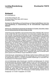 "content": "Landtag Brandenburg Drucksache 7/2219 7. Wahlperiode Antwort der Landesregierung auf die Kleine Anfrage Nr. 792 des Abgeordneten Ortwin Baier (SPD-Fraktion) Drucksache 7/2035 Sachstand der Beschaffung und Ausreichung von Grippe-Impfstoffdosen durch das Land Brandenburg im Zusammenhang mit der bevorstehenden Grippe-Saison 2020/2021 Namens der Landesregierung beantwortet die Ministerin für Soziales, Gesundheit, Integra- tion und Verbraucherschutz die Kleine Anfrage wie folgt: Vorbemerkung des Fragestellers: Die kommende Grippe-Saison 2020/2021 fällt zusammen mit der zweiten Welle der Corona-Pandemie. Da es noch keinen Impfstoff gegen das Co- rona-Virus gibt, ist es besonders wichtig, dass vor allem Risikopatientinnen und Risikopati- enten möglichst vollständig grippeschutzgeimpft werden, um eine mögliche Überlastung des Gesundheitssystems und einen deutlichen Anstieg der Sterbezahlen zu verhindern. Laut einem Beitrag des TV-Magazins „Monitor“ vom 21. September 2020 werden für die kom- mende Grippe-Saison 2020/2021 insgesamt mindestens 40 Millionen Impfstoffdosen benö- tigt, um alle in Deutschland lebenden Risikopatientinnen und Risikopatienten zu impfen. Die Vertreterinnen und Vertreter der verschiedenen systemrelevanten Berufe (medizinisches Personal, Pflegerinnen und Pfleger, Lehrerinnen und Lehrer, Erzieherinnen und Erzieher, Verkäuferinnen und Verkäufer, Polizistinnen und Polizisten, Mitarbeiterinnen und Mitarbeiter der öffentlichen Verwaltung etc.) sind in diese Zahl vermutlich zum überwiegenden Teil nicht einbegriffen. Die Zahl der bundesweit insgesamt zur Durchimpfung von Risikopatientinnen und Risikopatienten und Vertreterinnen und Vertreter systemrelevanter Berufe benötigten Grippe-Impfstoffdosen müsste demzufolge also um einiges über 40 Millionen liegen. Laut dem Bericht des TV-Magazin „Monitor“ vom 21. September 2020 wurden bundesweit bisher jedoch gerade einmal 20 Millionen Grippe-Impfstoffdosen bestellt. Vorbemerkung der Landesregierung: Die Ständige Impfkommission (STIKO) beim Robert Koch-Institut (RKI) bestätigt in Anbetracht der Auswirkungen der COVID-19-Pandemie in der Stellungnahme (Stand: 30. Juli 2020) die aktuellen Empfehlungen zur saisonalen Influ- enzaimpfung für die Influenzasaison 2020/21: „Da die Epidemiologie beider Erkrankungen hinsichtlich der Risikogruppen für schwere Krankheitsverläufe sehr deutliche Parallelen aufweist, ist die STIKO davon überzeugt, dass für die kommende Influenzasaison 2020/21 eine hohe Impfquote in den Risikogruppen er- reicht werden muss, um neben dem individuellen Schutz auch das Gesundheitssystem zu entlasten. Zusammengefasst ist zum Schutz der Menschen und zur Entlastung des Gesund- heitssystems in der kommenden Influenzasaison 2020/21 mit den verfügbaren Impfstoff- mengen der größte Effekt erzielbar, wenn die Influenzaimpfquoten entsprechend der STIKO-Empfehlungen vor allem in den Risikogruppen erheblich gesteigert werden. Die uns Eingegangen: 20.10.2020 / Ausgegeben: 26.10.2020",