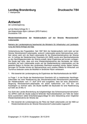 "content": "Landtag Brandenburg Drucksache 7/84 7. Wahlperiode Antwort der Landesregierung auf die Kleine Anfrage Nr. 3 des Abgeordneten Björn Lüttmann (SPD-Fraktion) Drucksache 7/20 Wiederinbetriebnahme der Heidekrautbahn auf der Strecke Wensickendorf- Liebenwalde Namens der Landesregierung beantwortet die Ministerin für Infrastruktur und Landespla- nung die Kleine Anfrage wie folgt: Vorbemerkung des Fragestellers: Seit 1997 fährt die Heidekrautbahn nicht mehr auf der Strecke Wensickendorf-Liebenwalde, wodurch Liebenwalde seinen Bahnanschluss verlor. Seit Jahren setzt sich die Stadt Liebenwalde für die Wiederinbetriebnahme der Strecke ein. Im Auftrag der Niederbarnimer Eisenbahn-AG (NEB) wurde eine Machbarkeitsstudie zu den Nachfragepotenzialen der Strecke erstellt, deren Ergebnisse seit kurzem vorliegen. Die Studie legt nahe, dass sich eine Wiederinbetriebnahme des Nordastes der Heide- krautbahn bis nach Liebenwalde positiv auf die Stadtentwicklung Liebenwaldes und die gesamte Region im Norden des Landkreises Oberhavel auswirken würde. Neben Verbes- serungen für Pendler könnte ein Bahnanschluss auch positive Effekte für Wirtschaft und Tourismus bedeuten sowie die Mobilität im ländlichen Raum verbessern. 1. Wie bewertet die Landesregierung die Ergebnisse der Machbarkeitsstudie der NEB? zu Frage 1: In der Studie der Niederbarnimer Eisenbahn AG zu bestehenden Nachfrage- potenzialen bei einer Reaktivierung des Streckenabschnitts Wensickendorf-Liebenwalde der Heidekrautbahn vom 17. April 2019 wird ausgeführt, dass bei einer Streckenver- längerung Wensickendorf-Liebenwalde mit einem Aufkommen von 470 Ein- und Aussteigern zu rechnen wäre. Die Studie beziffert die Baukosten für eine Reaktivierung auf mehr als 25 Mio. €. Aus Sicht des Landes Brandenburg als Aufgabenträger des Schienenpersonennahverkeh- res (SPNV) stellt die Studie aufgrund fehlender Nachvollziehbarkeit und Tiefe der Daten keine ausreichend valide Entscheidungsgrundlage für eine Überprüfung einer möglichen Wiederinbetriebnahme der Strecke dar. 2. Wie bewertet die Landesregierung die Pläne der Stadt Liebenwalde und der NEB zur Wiederinbetriebnahme der Strecke Wensickendorf-Liebenwalde insgesamt? Eingegangen: 21.10.2019 / Ausgegeben: 28.10.2019",