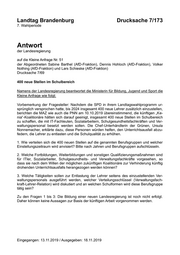 "content": "Landtag Brandenburg Drucksache 7/173 7. Wahlperiode Antwort der Landesregierung auf die Kleine Anfrage Nr. 51 der Abgeordneten Sabine Barthel (AfD-Fraktion), Dennis Hohloch (AfD-Fraktion), Volker Nothing (AfD-Fraktion) und Lars Schieske (AfD-Fraktion) Drucksache 7/69 400 neue Stellen im Schulbereich Namens der Landesregierung beantwortet die Ministerin für Bildung, Jugend und Sport die Kleine Anfrage wie folgt: Vorbemerkung der Fragesteller: Nachdem die SPD in ihrem Landtagswahlprogramm ur- sprünglich versprochen hatte, bis 2024 insgesamt 400 neue Lehrer zusätzlich einzustellen, berichten die MAZ wie auch die PNN am 10.10.2019 übereinstimmend, die künftigen „Ke- nia“-Koalitionäre hätten sich darauf geeinigt, insgesamt 400 neue Stellen im Schulbereich zu schaffen, die mit IT-Fachleuten, Sozialarbeitern, Schulgesundheitsfachkräften und Ver- waltungspersonal besetzt werden sollen. Die Chef-Unterhändlerin der Grünen, Ursula Nonnemacher, erklärte dazu, diese Personen würden helfen, den Unterrichtsausfall abzu- federn, die Lehrer zu entlasten und die Schulqualität zu erhöhen. 1. Wie verteilen sich die 400 neuen Stellen auf die genannten Berufsgruppen und welcher Einstellungszeitraum wird anvisiert? Bitte nach Jahren und Berufsgruppen aufschlüsseln. 2. Welche Fortbildungen, Weiterbildungen und sonstigen Qualifizierungsmaßnahmen sind für ITler, Sozialarbeiter, Schulgesundheits- und Verwaltungsfachkräfte vorgesehen, so dass sie nach dem Willen der möglichen zukünftigen Koalitionäre zur Verhinderung künftig drohenden Unterrichtsausfalls herangezogen werden können? 3. Welche Tätigkeiten sollen zur Entlastung der Lehrer seitens des einzustellenden Ver- waltungspersonals ausgeführt werden, welcher Verteilungsschlüssel (Verwaltungsfach- kraft-Lehrer-Relation) wird diskutiert und an welchen Schulformen wird diese Berufsgruppe tätig sein? Zu den Fragen 1 bis 3: Die Bildung einer neuen Landesregierung ist noch nicht erfolgt. Daher können keine Aussagen zur Basis der künftigen Arbeit vorgenommen werden. Eingegangen: 13.11.2019 / Ausgegeben: 18.11.2019",