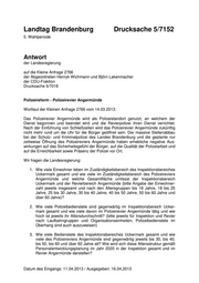 "content": "Landtag Brandenburg Drucksache 5/7152 5. Wahlperiode Antwort der Landesregierung auf die Kleine Anfrage 2766 der Abgeordneten Henryk Wichmann und Björn Lakenmacher der CDU-Fraktion Drucksache 5/7018 Polizeireform - Polizeirevier Angermünde Wortlaut der Kleinen Anfrage 2766 vom 14.03.2013: Das Polizeirevier Angermünde wird als Polizeistandort genutzt, an welchem der Dienst begonnen und beendet wird und die Revierpolizei ihren Dienst verrichtet. Nach der Einführung von Schließzeiten wird das Polizeirevier Angermünde zukünftig nicht mehr rund um die Uhr für die Bürger geöffnet sein. Der massive Stellenabbau bei der Schutz- und Kriminalpolizei des Landes Brandenburg und die geplante nur zeitweise Öffnung des Polizeireviers Angermünde haben erhebliche negative Aus- wirkungen auf das Sicherheitsgefühl der Bürger, auf die Qualität der Polizeiarbeit und auf die Erreichbarkeit sowie Präsenz der Polizei vor Ort. Wir fragen die Landesregierung: 1. Wie viele Einwohner leben im Zuständigkeitsbereich des Inspektionsbereiches Uckermark gesamt und wie viele im Zuständigkeitsbereich des Polizeireviers Angermünde und welche Gesamtfläche umfasst der Inspektionsbereich Uckermark und der Revierbereich Angermünde (bitte Angabe der Einwohner- zahl jeweils insgesamt und nach den Altersgruppen bis 18 Jahre, 18 bis 25 Jahre, 25 bis 30 Jahre, 30 bis 40 Jahre, 40 bis 50 Jahre, 50 bis 60 Jahre und über 60 Jahre)? 2. Wie viele Polizeibedienstete sind gegenwärtig im Inspektionsbereich Ucker- mark gesamt und wie viele davon im Polizeirevier Angermünde tätig und wie hoch ist jeweils ihr Altersdurchschnitt? (bitte jeweils für Inspektion und Revier nach Laufbahngruppen und Organisationseinheiten; Polizeibedienstete im Überhang sind auch auszuweisen) 3. Wie viele Bedienstete des Inspektionsbereiches Uckermark gesamt und wie viele des Polizeireviers Angermünde sind gegenwärtig jeweils bis 30, bis 40, bis 50, bis 60 und über 60 Jahre alt? Wie wird sich diese Altersstruktur gemäß Personalentwicklungsplanung im Jahr 2020 in der Inspektion gesamt und im Revier Angermünde darstellen? Datum des Eingangs: 11.04.2013 / Ausgegeben: 16.04.2013",
