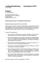 "content": "Landtag Brandenburg Drucksache 4/7817 4. Wahlperiode Antwort der Landesregierung auf die Kleine Anfrage Nr. 2893 des Abgeordneten Dr. Jens Klocksin Fraktion der SPD Landtagsdrucksache 4/7615 Brandenburgisches Haupt- und Landgestüt Neustadt (Dosse) Wortlaut der Kleinen Anfrage Nr. 2893 vom 26.05.2009: Bereits seit über 220 Jahren werden im Gestüt Neustadt (Dosse) Pferde gezüchtet und ausgebildet. 2001 wurde das Gestüt eine Stiftung des öffentlichen Rechts. Die Wirtschaftsprüfung im November 2008 löste ein Ermittlungsverfahren der Staatsan- waltschaft Neuruppin wegen Verdachts der Untreue und des Betruges aus. Ich frage die Landesregierung: 1. Wo ist seit 2001 im Ministerium für Ländliche Entwicklung, Umwelt und Ver- braucherschutz (MLUV) die Rechtsaufsicht über die Stiftung angesiedelt? 2. Wie wurde gewährleistet, dass seit Gründung der Stiftung „Brandenburgisches Haupt- und Landgestüt Neustadt (Dosse)“ die Mitglieder des Stiftungsrates und ggf. des Kuratoriums über Entscheidungen und Handeln des Stiftungs- ratsvorsitzenden informiert waren? 3. Liegen jährliche Wirtschaftsprüfungsberichte zur Arbeit der Stiftung vor? In welcher Form hat sich der Stiftungsrat damit befasst? 4. Wie wurden die Landesrechnungshofberichte aus den Jahren 2001 und 2007 in Stiftungsrat und Kuratorium behandelt? 5. Gab es Beratungen zwischen dem Kuratorium der Stiftung, dem Stiftungsrat und dem Landstallmeister, um die vom Landesrechnungshof in den Jahren 2001 und 2007 aufgezeigten Mängel in der Geschäftsführung zu beheben? Wenn ja, mit welchem Ergebnis und mit welchen Folgen? 6. Wann wurden die Wirtschaftskonzepte, mit denen Fördermittel für die Gestüte eingeworben wurden, dem Kuratorium und dem Stiftungsrat zur Kenntnisnah- me bzw. zur Zustimmung vorgelegt? Datum des Eingangs: 16.07.2009 / Ausgegeben: 21.07.2009",