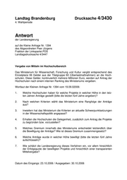 "content": "Landtag Brandenburg Drucksache 4/3430 4. Wahlperiode Antwort der Landesregierung auf die Kleine Anfrage Nr. 1394 des Abgeordneten Peer Jürgens Fraktion der Linkspartei.PDS Landtagsdrucksache 4/3447 Vergabe von Mitteln im Hochschulbereich Das Ministerium für Wissenschaft, Forschung und Kultur vergibt entsprechend des Einzelplans 06 Gelder aus der Titelgruppe 60 (Überlastmaßnahmen) an die Hoch- schulen. Diese Gelder, kontinuierlich mehrere Millionen Euro, werden auf Antrag der Hochschulen nach einem internen Ranking des Ministeriums vergeben. Wortlaut der Kleinen Anfrage Nr. 1394 vom 19.09.02006: 1. Welche Hochschulen haben für welche Projekte in welcher Höhe in den letz- ten Jahren Anträge gestellt (bitte die letzten fünf Jahre angeben)? 2. Nach welchen Kriterien wählt das Ministerium eine Rangfolge der Anträge aus? 3. Inwiefern hat das Ministerium die Kriterien an aktuelle Schwerpunktsetzungen in der Wissenschaftspolitik angepasst? 4. Erhalten die Hochschulen die Gelegenheit, zusätzlich zum Antrag die Projekte zu begründen bzw. vorzustellen? 5. Welches Gremium innerhalb des Ministeriums entscheidet letztendlich über die Bewilligung der Anträge? Wie ist dieses Gremium zusammengesetzt? 6. Welche Anträge wurde in welcher Höhe bewilligt (bitte die letzten fünf Jahre aufschlüsseln)? 7. Wie schätzt die Landesregierung dieses Verfahren ein, vor allem hinsichtlich der Erfolgsquote der bewilligten Projekte und hinsichtlich einer transparenten Mittelvergabe? Datum des Eingangs: 23.10.2006 / Ausgegeben: 30.10.2006",