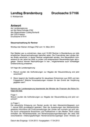 "content": "Landtag Brandenburg Drucksache 5/7166 5. Wahlperiode Antwort der Landesregierung auf die Kleine Anfrage 2762 des Abgeordneten Ludwig Burkardt der CDU-Fraktion Drucksache 5/7014 Steuernachzahlung für Rentner Wortlaut der Kleinen Anfrage 2762 vom 14. März 2013 Den Medien war zu entnehmen, dass rund 10.000 Rentner in Brandenburg von teils erheblichen Steuernachzahlungen betroffen seien. Die Finanzämter des Landes hät- ten Briefe verschickt, in denen Rentner aufgefordert würden, ihre Steuerpflicht rück- wirkend für die Jahre bis 2005 zu prüfen und entsprechend Steuererklärungen abzu- geben. Daraus können Nachzahlungen in vier-, möglicherweise auch fünfstelliger Größenordnung entstehen. Ich frage die Landesregierung: 1. Warum wurden die Aufforderungen zur Abgabe der Steuererklärung erst jetzt verschickt? 2. Wann beginnt die Verjährungsfrist für steuerbare Einkommen aus 2005 und den Folgejahren? Welche Voraussetzungen müssen für den Eintritt der Verjährung gegeben sein? Namens der Landesregierung beantwortet der Minister der Finanzen die Kleine An- frage wie folgt: Frage 1: Warum wurden die Aufforderungen zur Abgabe der Steuererklärung erst jetzt ver- schickt? zu Frage 1: Die steuerliche Erfassung von Renten wurde mit dem Alterseinkünftegesetz zum 1. Januar 2005 grundlegend geändert. Über die Auswirkungen des Alterseinkünfte- gesetzes informieren die Finanzverwaltungen der Länder seit nunmehr gut acht Jah- ren durch umfangreiche Broschüren und Publikationen in den Medien. Nicht zuletzt enthalten die Rentenbescheide und Rentenanpassungsmitteilungen der etwa 500 verschiedenen mitteilungspflichtigen Rentenversicherungsträger einen Hinweis auf Datum des Eingangs: 12.04.2013 / Ausgegeben: 17.04.2013",