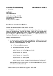 "content": "Landtag Brandenburg Drucksache 4/7974 4. Wahlperiode Antwort der Landesregierung auf die Kleine Anfrage Nr. 2982 des Abgeordneten Michael Claus Fraktion der DVU Landtagsdrucksache 4/7846 Neue Debatte um elektronische Fußfessel Wortlaut der Kleinen Anfrage Nr. 2982 vom 28. Juli 2009: Am 17.07.2009 war der Presse zu entnehmen, im Berliner Abgeordnetenhaus werde derzeit ein rechtspolitischer Vorschlag der dortigen Fraktion der CDU diskutiert, elek- tronische Fußfesseln als Alternative für Straf- bzw. Untersuchungshaft nach dem Vor- bild einer Regelung im Bundesland Hessen einzuführen, wo der Einsatz elektronischer Fußfesseln bereits seit neun Jahren praktiziert werden. Ich frage die Landesregierung: 1. Im Rahmen welcher exekutiver und / oder legislativer Maßnamen kommt aus Sicht der Landesregierung aus verfassungsrechtlicher Sicht der Einsatz elekt- ronischer Fußfesseln in Betracht, und zwar a) im Rahmen der Gefahrenabwehr, b) als repressive Maßname, und zwar aa) im Rahmen der Strafverfolgung und / oder bb) im Rahmen des Strafhaft, cc) im Rahmen von Ersatzstrafen, dd) im Rahmen von Ordnungshaft, ee) im Rahmen welcher sonstigen freiheitsentziehenden Maßnahmen? (Bitte detaillierte Darlegung im Hinblick auf unterschiedliche Bereiche präventi- ver und repressiver Maßnahmen!) Datum des Eingangs: 10.09.2009 / Ausgegeben: 15.09.2009",