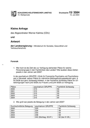 "content": "SCHLESWIG-HOLSTEINISCHER LANDTAG Drucksache 15/ 3584 15. Wahlperiode 15. Juli 2004 Kleine Anfrage des Abgeordneten Werner Kalinka (CDU) und Antwort der Landesregierung – Ministerium für Soziales, Gesundheit und Verbraucherschutz Forensik 1. Wie hoch ist die Zahl der zur Verfügung stehenden Plätze für welche Personengruppe in den Fachkliniken des Landes? Wie lauteten diese Zahlen jeweils in den Jahren seit 2000? In der psychatrium GRUPPE ( Klinik für Forensiche Psychiatrie und Psychothera- pie) in Neustadt stehen Plätze für männliche Maßregelvollzugspatienten gem. § 63 StGB aus ganz Schleswig-Holstein, in der Fachklinik Schleswig Plätze für Un- terbringungen nach § 63 StGB (nur Frauen) und § 64 StGB zur Verfügung. Plätze psychatrium GRUPPE Fachklinik Schleswig 2000 215 50 2001 215 50 2002 215 50 2003 215 55 2004 215 64 2. Wie groß war jeweils die Belegung in den Jahren seit 2000? Durchschnittliche Belegung psychatrium GRUPPE Fachklinik Schleswig 2000 233 50 2001 234 49 2002 233 54 2003 238 59 2004 242 (Stichtag: 20.07.) 62 (bis 31.05.)",