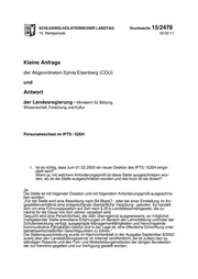 "content": "SCHLESWIG-HOLSTEINISCHER LANDTAG Drucksache 15/2478 15. Wahlperiode 03-02-11 Kleine Anfrage der Abgeordneten Sylvia Eisenberg (CDU) und Antwort der Landesregierung - Ministerin für Bildung, Wissenschaft, Forschung und Kultur Personalwechsel im IPTS / IQSH 1. Ist es richtig, dass zum 01.02.2003 ein neuer Direktor des IPTS / IQSH einge- stellt wird? Wenn ja, mit welchem Anforderungsprofil ist diese Stelle ausgeschrieben wor- den, wo ist die Stelle ausgeschrieben worden und wie hoch ist sie dotiert? Ja. Die Stelle ist mit folgender Dotation und mit folgendem Anforderungsprofil ausgeschrie- ben worden: „Für die Stelle wird eine Besoldung nach B4 BbesO - oder bei einer Einstellung im An- gestelltenverhältnis eine entsprechende übertarifliche Vergütung - geboten. Es handelt sich um eine Führungsposition auf Zeit nach § 20 b Landesbeamtengesetz, die zu- nächst für die Dauer von fünf Jahren vergeben wird. Gesucht wird eine Persönlichkeit, die über überregional ausgewiesene, an möglichst maßgebender Stelle erworbene Erfahrungen im Bereich der Lehrerbildung und/oder der Schulentwicklung verfügt, ausgeprägte Managementfähigkeiten und hervorragende kommunikative Fähigkeiten besitzt und in der Lage ist, eine öffentliche Einrichtung unter betriebswirtschaftlichen Gesichtspunkten zu führen.“ Die Stellenausschreibung wurde im Nachrichtenblatt in der Ausgabe September 9/2002 sowie über den Landesbildungsserver im Internet veröffentlicht; sie ist zudem den zu- ständigen Ressorts und den Fort- und Weiterbildungsinstituten der übrigen Bundeslän- der zur Kenntnis gegeben und zur Verfügung gestellt worden.",