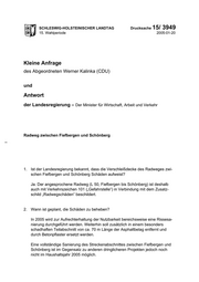 "content": "SCHLESWIG-HOLSTEINISCHER LANDTAG Drucksache 15/ 3949 15. Wahlperiode 2005-01-20 Kleine Anfrage des Abgeordneten Werner Kalinka (CDU) und Antwort der Landesregierung – Der Minister für Wirtschaft, Arbeit und Verkehr Radweg zwischen Fiefbergen und Schönberg 1. Ist der Landesregierung bekannt, dass die Verschleißdecke des Radweges zwi- schen Fiefbergen und Schönberg Schäden aufweist? Ja. Der angesprochene Radweg (L 50, Fiefbergen bis Schönberg) ist deshalb auch mit Verkehrszeichen 101 („Gefahrstelle“) in Verbindung mit dem Zusatz- schild „Radwegschäden“ beschildert. 2. Wann ist geplant, die Schäden zu beheben? In 2005 wird zur Aufrechterhaltung der Nutzbarkeit bereichsweise eine Rissesa- nierung durchgeführt werden. Weiterhin soll zusätzlich in einem besonders schadhaften Teilabschnitt von ca. 70 m Länge der Asphaltbelag entfernt und durch Betonpflaster ersetzt werden. Eine vollständige Sanierung des Streckenabschnittes zwischen Fiefbergen und Schönberg ist im Gegensatz zu anderen dringlicheren Projekten jedoch noch nicht im Haushaltsjahr 2005 möglich.",