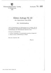 "content": "Schleswig-Holsteinischer Landtag Drucksache Nr. 488 3. Wahlperiode 1954 Kleine Anfrage Nr. 43 des Abgeordneten Hart) (SHB) betr. Lärmbekämpfung Auf der Pressekonferenz der Landesregierung am 19. Oktober 1955 hat der Amtschef des Innenministeriums mitgeteilt, daß eine Verordnung zur Lärmbekämpfung vom Innenministerium vorbereitet werde. ld1 frage die Landesregierung: 1. Ist diese Verordnung zur Lärmbekämpfung inzwischen fertiggestellt? 2, Wann ist mit der Veröffentlidwng zu rechnen? Kiel, den 3. September 1956 Hartz Druck und Vertrieb: S<hmidt & Klaunig, Kiel",