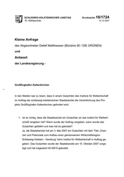 "content": "SCHLESWIG-HOLSTEINISCHER LANDTAG Drucksache 16/1724 16. Wahlperiode 10.12.2007 Kleine Anfrage des Abgeordneten Detlef Matthiessen (Bündnis 90 / DIE GRÜNEN) und Antwort der Landesregierung - Großflughafen Kaltenkirchen In den Medien war zu lesen, dass in einem Gutachten des Instituts für Weltwirtschaft im Auftrag der schleswig-holsteinischen Staatskanzlei die Verwirklichung des Pro- jekts Großflughafen Kaltenkirchen gefordert wird. 1. Ist es richtig, dass die Staatskanzlei ein Gutachten an das Institut für Weltwirt- schaft vergeben hat? Wann wurde der Auftrag vergeben, wann wurde das Gutachten geliefert und was hat es gekostet? Ja, die Staatskanzlei hat am 3. Mai 2007 ein Gutachten mit dem Titel „Chan- cen und Potenziale zum Aufbau einer gemeinsamen Wirtschaftsregion Schleswig-Holstein - Hamburg“ beim Institut für Weltwirtschaft in Auftrag ge- geben. Das Gutachten wurde der Staatskanzlei am 15. Oktober 2007 vorge- legt und hat insgesamt 40.000 € gekostet.",