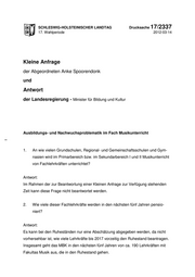 "content": "SCHLESWIG-HOLSTEINISCHER LANDTAG Drucksache 17/2337 17. Wahlperiode 2012-03-14 Kleine Anfrage der Abgeordneten Anke Spoorendonk und Antwort der Landesregierung - Minister für Bildung und Kultur Ausbildungs- und Nachwuchsproblematik im Fach Musikunterricht 1. An wie vielen Grundschulen, Regional- und Gemeinschaftsschulen und Gym- nasien wird im Primarbereich bzw. im Sekundarbereich I und II Musikunterricht von Fachlehrkräften unterrichtet? Antwort: Im Rahmen der zur Beantwortung einer Kleinen Anfrage zur Verfügung stehenden Zeit kann diese Frage nicht beantwortet werden. 2. Wie viele dieser Fachlehrkräfte werden in den nächsten fünf Jahren pensio- niert? Antwort: Es kann bei den Ruheständen nur eine Abschätzung abgegeben werden, da nicht vorhersehbar ist, wie viele Lehrkräfte bis 2017 vorzeitig den Ruhestand beantragen. Insgesamt geht das MBK in den nächsten fünf Jahren von ca. 190 Lehrkräften mit Fakultas Musik aus, die in den Ruhestand gehen.",