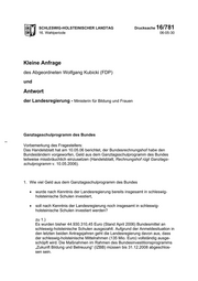 "content": "SCHLESWIG-HOLSTEINISCHER LANDTAG Drucksache 16/781 16. Wahlperiode 06-05-30 Kleine Anfrage des Abgeordneten Wolfgang Kubicki (FDP) und Antwort der Landesregierung - Ministerin für Bildung und Frauen Ganztagsschulprogramm des Bundes Vorbemerkung des Fragestellers: Das Handelsblatt hat am 10.05.06 berichtet, der Bundesrechnungshof habe den Bundesländern vorgeworfen, Geld aus dem Ganztagsschulprogramm des Bundes teilweise missbräuchlich einzusetzen (Handelsblatt, Rechnungshof rügt Ganztags- schulprogramm v. 10.05.2006). 1. Wie viel Geld aus dem Ganztagsschulprogramm des Bundes • wurde nach Kenntnis der Landesregierung bereits insgesamt in schleswig- holsteinische Schulen investiert, • soll nach Kenntnis der Landesregierung noch insgesamt in schleswig- holsteinische Schulen investiert werden? zu 1.) Es wurden bisher 44.930.310,45 Euro (Stand April 2006) Bundesmittel an schleswig-holsteinische Schulen ausgezahlt. Aufgrund der Anmeldesituation in den letzten beiden Antragsjahren geht die Landesregierung davon aus, dass der schleswig-holsteinische Mittelrahmen (135 Mio. Euro) vollständig ausge- schöpft wird. Die Maßnahmen im Rahmen des Bundesinvestitionsprogramms „Zukunft Bildung und Betreuung“ (IZBB) müssen bis 31.12.2008 abgeschlos- sen sein.",