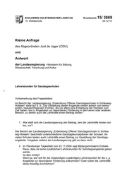 "content": "SCHLESWIG-HOLSTEINISCHER LANDTAG Drucksache 15/ 3869 15. Wahlperiode 04-12-10 Kleine Anfrage des Abgeordneten Jost de Jager (CDU) und Antwort der Landesregierung - Ministerin für Bildung, Wissenschaft, Forschung und Kultur Lehrerstunden für Ganztagsschulen Vorbemerkung des Fragestellers: Im Bericht der Landesregierung „Entwicklung Offener Ganztagsschulen in Schleswig- Holstein“ steht auf S. 8: „Die Gestaltung dieser Angebote variiert jedoch von betreu- enden, beaufsichtigenden Formen, die vor allem eine Entlastung der Familien zum Ziel haben, bis zu Angeboten zur besonderen Förderung in dem einen oder anderen Bereich, zu denen auch die Lehrkräfte einen Beitrag leisten.“ 1. Wie stellt sich die Landesregierung den Beitrag, den die Lehrkräfte leisten sol- len, vor? Der Bericht der Landesregierung „Entwicklung Offener Ganztagsschulen in Schles- wig-Holstein“ beschreibt unterschiedliche Ganztagskonzeptionen der Schulen. An vielen Schulen leisten auch Lehrkräfte einen Beitrag zur Gestaltung der Ganztags- angebote. Vorgaben seitens der Landesregierung gibt es dazu nicht. 2. Im Flensburger Tagesblatt vom 22.11.2004 sagt Bildungsministerin Erdsiek- Rave, dass es keine zusätzlichen Lehrerstunden für Ganztagsangebote geben werde. Ist dies richtig? Wenn ja, wer soll für die notwendigen zuständigen Lehrerstunden für die o. g. Angebote zur besonderen Förderung aufkommen? Oder sollen die Lehrkräfte diese freiwillig durchführen?",