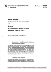 "content": "SCHLESWIG-HOLSTEINISCHER LANDTAG Drucksache 12/905 12. Wahlperiode 25.06.90 Kleine Anfrage des Abgeordneten Dr. Peter Bendixen (CDU) und Antwort der Landesregierung - Ministerin für Bildung, Wissenschaft, Jugend und Kultur - Förderung der plattdeutschen Sprache l. Gibt es Untersuchungen oder Schätzungen. die offenlegen, wie viele Menschen in Schleswig-Holstein die plattdeutsche Sprache beherrschen bzw. verstehen? Im Auftrag des Instituts für niederdeutsche Sprache in Bremen wurde 1984 von der Gesellschaft für angewandte Sozialspychologie (GETAS), Bremen, in Norddeutschland eine Repräsentativ-Erhebung \"Zur Lage des Niederdeutschen\" durchgeführt. Erste Ergebnisse sind inzwischen veröffentlicht (Dieter Stellmacher: Wer spricht platt? Eine kurzgefaßte Bestandsaufnahme, Leer 1987); die Umfragemate- rialien und -tabellen für das Land Schleswig-Holstein befinden sich in der Niederdeutschen Abteilung des Germanistischen Seminars der Universität Kiel (GETAS Tabellenbericht zur Lage des Niederdeut- schen: Gesamtergebnisse 1984). l. a) Wenn ja, mit welchen Ergebnissen° Nach der GETAS-Erhebung (Selbsteinschätzung) verfügen in Schles- wig-Holstein ca. 47% der Bevölkerung über gute bis sehr gute platt- deutsche Sprachkenntnisse (aktive Sprachkompetenz). Niederdeutsch Die Landtagsdrucksachen sind fortlaufend und einzeln beim Verlag Schmidt & Klaunig, Ringstraße 19. 2300 Kiel1, Fernruf 04 31/6 20 95, zu beziehen.",