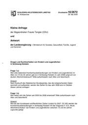 "content": "SCHLESWIG-HOLSTEINISCHER LANDTAG Drucksache 16/2672 16. Wahlperiode 29. Mai 2009 Kleine Anfrage der Abgeordneten Frauke Tengler (CDU) und Antwort der Landesregierung – Ministerium für Soziales, Gesundheit, Familie, Jugend und Senioren Drogen und Suchtverhalten von Kindern und Jugendlichen in Schleswig-Holstein Frage 1 a) Wie viele stationäre Krankenhausbehandlungen von Kindern und Jugendlichen im Alter von 10 bis 20 Jahren gab es in Schleswig-Holstein im Jahr 2008 aufgrund von akutem Alkoholmissbrauch? Bitte aufschlüsseln nach Alter und Geschlecht. Antwort: Nach Auskunft des Statistischen Bundesamtes, das die entsprechenden Daten sammelt und aufbereitet, werden die Zahlen für das Jahr 2008 erst im Oktober diesen Jahres vorliegen. Frage 1 b) Wie haben sich die Zahlen seit 2000 bis 2008 entwickelt? Bitte aufschlüsseln nach Alter und Geschlecht. Antwort: Wie bei den bundesweit veröffentlichten Zahlen (zuletzt für 2007: 23.165) werden die Krankenhausbehandlungen in Schleswig-Holstein mit der Diagnose F 10.0 „Akute Alkoholintoxikation“ bei Kindern und Jugendlichen zwischen 10 und 20 Jahren zugrunde gelegt.",