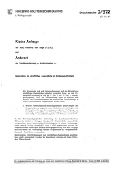 "content": "SCHLESWIG-HOLSTEINISCHER LANDTAG Drucksache 9/872 9. Wahlperiode 27. 01. 81 Kleine Anfrage der Abg. Hadewig und Auge (F.D.P.) und Antwort der Landesregierung - Justizminister - Heimplätze für straffällige Jugendliche in Schleswig-Holstein Die ErkenntniS, daß sich Untersuchungshaft auf die Entwicklung straffälliger Jugendlicher schädlich auswirken kann, hat den Ge- setzgeb'er veranlaßt, in den §§ 71 Abs. 2 und 72 Abs. 3 Jugend- geridltsgesetz (JGG) die Voraussetzling dafür zu schaffen, daß anstelle der Untersud1Ungshaft die einstweilige Uriterbringung in einem Erziehungsheim vorgenommen werden kann. 1. Wieviel Plätze stehen in Schleswig-Holstein (unter Angabe der Gruppenstärken, aufgeteilt nach Geschlecht und mit Angabe der Stellenpläne für das Betreuungspersonal) zur Verfügung, um straffällige Jugendliche zur Vermeidung der Untersuchungshaft einstweilig in einem Erziehungsheim unterbringen zu können? In der Sonderpädagogischen Abteilung des Landesjugendheimes Sdlleswig sind zwei Gruppen für jeweils 10 männlid1e Jugendlid1e vorgesehen, deren einstweilige Unterbringung in einem Erziehungs- heim nach § 71 Abs. 2 und § 72 Abs. 3 JGG angeordnet worden ist. Angesichts des bisherigen Bedarfs steht gegenwärtig erst eine Gruppe mit 10 Plätzen zur Verfügung. Für die Gruppe sind 6,5 Gruppenerzie- her und 1 Praktikant vorgesehen. Einstweilige Unterbringungen von weiblichen Jugendlichen sind bis- lang nicht angeordnet worden. Im Bedarfsfall stünden im Heim Oelix- dorf Plätze bereit. Dle Landtagsdrucksachen sind forttaufend und einzeln beim Verlag Schmldt & Klaunlg, Ringstraße 19, 2300 Klei, Fernruf 6 20 95196, zu beziehen.",