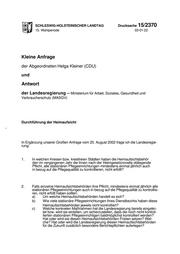 "content": "SCHLESWIG-HOLSTEINISCHER LANDTAG Drucksache 15/2370 15. Wahlperiode 03-01-22 Kleine Anfrage der Abgeordneten Helga Kleiner (CDU) und Antwort der Landesregierung – Ministerium für Arbeit, Soziales, Gesundheit und Verbraucherschutz (MASGV) Durchführung der Heimaufsicht In Ergänzung unserer Großen Anfrage vom 20. August 2002 frage ich die Landesregie- rung: 1. In welchen Kreisen bzw. kreisfreien Städten haben die Heimaufsichtsbehör den im vergangenen Jahr die ihnen nach der Heimgesetznovelle obliegende Pflicht, alle stationären Pflegeeinrichtungen mindestens einmal jährlich auch in bezug auf die Pflegequalität zu kontrollieren, nicht erfüllt? 2. Falls einzelne Heimaufsichtsbehörden ihre Pflicht, mindestens einmal jährlich alle stationären Pflegeeinrichtungen auch in bezug auf die Pflegequalität zu kontrollie- ren, nicht erfüllt haben sollten: a) Um welche Heimaufsichtsbehörden handelt es sich? b) Wie viele stationäre Pflegeeinrichtungen ihres Dienstbezirks haben diese Heimaufsichtsbehörden jeweils nicht kontrolliert? c) Welche konkreten Maßnahmen hat die Landesregierung bereits eingelei- tet bzw. wird sie einleiten, um sicherzustellen, dass die noch nicht kontrol- lierten stationären Pflegeeinrichtigen baldmöglichst kontrolliert werden? Hat oder wird sie diesen Heimaufsichtsbehörden Fristen setzen? Wel- che? Hat oder wird die Landesregierung diesen Heimaufsichtsbehörden für die Zukunft zusätzlich besondere Berichtspflichten auferlegen?",