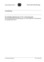 "content": "Wissenschaftliche Dienste Ausarbeitung Seite 2 WD 7 - 3000 - 037/19 Zur Beihilfestrafbarkeit bei § 17 Nr. 2 Tierschutzgesetz Die amtstierärztliche Genehmigung von Tiertransporten in Drittstaaten als Strafbarkeitsrisiko? Aktenzeichen: WD 7 - 3000 - 037/19 Abschluss der Arbeit: 19. März 2019 Fachbereich: WD 7: Zivil-, Straf- und Verfahrensrecht, Umweltschutzrecht, Bau und Stadtentwicklung Die Wissenschaftlichen Dienste des Deutschen Bundestages unterstützen die Mitglieder des Deutschen Bundestages bei ihrer mandatsbezogenen Tätigkeit. Ihre Arbeiten geben nicht die Auffassung des Deutschen Bundestages, eines sei- ner Organe oder der Bundestagsverwaltung wieder. Vielmehr liegen sie in der fachlichen Verantwortung der Verfasse- rinnen und Verfasser sowie der Fachbereichsleitung. Arbeiten der Wissenschaftlichen Dienste geben nur den zum Zeit- punkt der Erstellung des Textes aktuellen Stand wieder und stellen eine individuelle Auftragsarbeit für einen Abge- ordneten des Bundestages dar. Die Arbeiten können der Geheimschutzordnung des Bundestages unterliegende, ge- schützte oder andere nicht zur Veröffentlichung geeignete Informationen enthalten. Eine beabsichtigte Weitergabe oder Veröffentlichung ist vorab dem jeweiligen Fachbereich anzuzeigen und nur mit Angabe der Quelle zulässig. Der Fach- bereich berät über die dabei zu berücksichtigenden Fragen.",