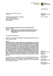 "content": "STAATSNHNISTERIUNI Freistaat DES 1NNERN SACH SEN Frage 5: Wie viele Haftbeschlüsse welcher sächsischer Amtsgerichte wurden von den Gerichten welcher gerichtlichen Instanz aufgehoben und innerhalb welchen Zeit- raums erfolgte die Entlassung? Vom 3. Dezember 2019 bis zum 31. März 2020 hat die zuständige Beschwerdekammer des Landgerichts Dresden keine amtsgerichtlichen Abschiebungshaftbeschlüsse auf- gehoben. In dem angefragten Zeitraum wurden durch das Amtsgericht Dresden vier Haftbe- schlüsse, die das Amtsgericht Dresden gefasst hatte, aufgehoben. In allen Fällen wur— den die Betroffenen sofort auf Anweisung der antragstellenden Behörde entlassen. Mit freundlichen Grüßen in Vertretung W Hartmut Vorjoha n Anlagen: 2 Seite 3 von 3",