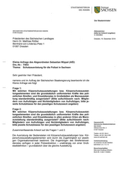 "content": "STAATSMINISTERIUM Freistaat DES iNNERN SACH SEN Der Staatsminister SÄCHSISCHES STAATSMINISTERIUM DES INNERN Aktenzeichen 01095 Dresden (bitte bei Antwort angeben) 3-1053/89/2 Präsidenten des Sächsischen Landtages Dresden, 19. Dezember 2019 Herrn Dr. Matthias Rößler Bernhard—von-Lindenau-Platz 1 01067 Dresden Kleine Anfrage des Abgeordneten Sebastian Wippel (AfD) Drs.-Nr.: 7/653 Thema: Schutzausrüstung für die Polizei in Sachsen Sehr geehrter Herr Präsident, namens und im Auftrag der Sächsischen Staatsregierung beantworte ich die Kleine Anfrage wie folgt: Frage 1: Mit welchen Köperschutzausstattungen bzw. Körperschutzausstat- tungselementen sind die grundsätzlich uniformierten Kräfte des poli- zeilichen Streifen- und Einzeldienstes in Großstädten als Mannausstat- tung standardmäßig ausgerüstet? (Bitte aufschlüsseln nach: Mitglie- dern von Aufrufzügen und Nichtmitgliedern von Aufrufzügen, bitte je- weils Schutzklasse für den jeweiligen Schutzzweck angeben) Frage 2: Mit welchen Köperschutzausstattungen bzw. Körperschutzausstat- tungselementen sind die grundsätzlich uniformierten Kräfte des poli- zeilichen Streifen- und Einzeldienstes in allen anderen Orten als Mann- ausstattung standardmäßig ausgerüstet? (Bitte aufschlüsseln nach: Mitgliedern von Aufrufzügen und Nichtmitgliedern von Aufrufzügen, Hausanschrift: Sächsisches Staatsministerium bitte jeweils Schutzklasse für den jeweiligen Schutzzweck angeben) des Innern Wilhelm-Buck-Str. 2 Zusammenfassende Antwort auf die Fragen 1 und 2: 01097 Dresden Telefon +49 351 564-0 Die Ausrüstung der Bediensteten mit Körperschutzausstattungen bzw. Kör- Telefax +49 351 564-3199 www.smi.sachsen.de perschutzausstattungselementen wird durch die Zugehörigkeit zur jeweili- gen Organisationseinheit bestimmt. Die Angehörigen des Streifeneinzel- Verkehrsanbindung: dienstes verfügen in jeder Polizeidirektion — unabhängig von einer Groß- Zu erreichen mit den Straßen- bahnlinien 3, 6, 7, 8, 13 stadtdefinition — grundsätzlich über die gleiche Ausstattung. Besucherparkplätze: Bitte beim Empfang Wilhelm— Buck-Str. 2 oder 4 melden.",