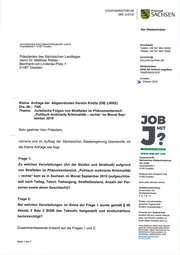 "content": "STAATSMINISTERIUIVI DER JUSTIZ t Freistaat SACHSEN Der Staatsminister SACHSISCHES STAATSMINISTERIUM DER JUSTIZ Durchwahl Hospitalstraße 7 |.01097 Dresden Telefon +49 351 564-15000 Telefax +49 351 564-15009 Präsidenten des Sächsischen Landtages poststelle@ Herrn Dr. Matthias Rößler smj.justiz.sachsen.de* Bernhard-von-Lindenau-Platz 1 Aktenzeichen 01067 Dresden (bitte bei Antwort angeben) 10408t30t22-KLR Dresden, p. oktober 2019 Kleine Anfrage der Abgeordneten Kerstin Köd¡tz (DlE LINKE) Drs.-Nr.: 7/45 Thema: Juristische Folgen von Straftaten im Phänomenbereich ,,Politisch motivierte Kriminalität - rechts\" im Monat Sep- tember 2019 TOB MIT Sehr geehrter Herr Präsident, namens und im Auftrag der Sächsischen Staatsregierung beantworte ich die Kleine Anfrage wie folgt: eo ¡l[rMmtall|nrrr WWWJOB.M¡T-¡.DE Hausanschrift: Frage 1: Sächsisches Staatsministerium der Justiz Zu welchen Verurteilungen (Art der Strafen und Strafmaß) aufgrund Hospitalstraße 7 01097 Dresden von Straftaten im Phänomenbereich,,Politisch mot¡v¡erte Kriminalität Briefpost tiber Deutsche Post - rechts\" kam es in Sachsen im Monat September 2019 (aufgeschlüs- 01095 Dresden selt nach Tattag, Tatort, Tathergang, Straftatbestand, Anzahl der Per- www. justiz. sachsen. de/smj sonen sowie deren Geschlecht)? Verkehrsvorbindung: Zu erreichen mit Straßenbahnlinien 3, 6,7 , 8, 11 Frage 2: Parken und behinderten- Bei welchen Verurteilungen im Sinne der Frage I wurde gemäß $ 46 gerechter Zugang ilber Einfahrt Hospitalshaße 7 Absatz 2 salz 2 stGB das Tatmotiv festgestellt und strafschärfend Hinweise zum DatenschuÞ erhalten Sie auf unserer lnternet- berücksichtigt? seite. Auf Wunsch senden wir lhnen diese Hinweise auch zu. .Kein Zugang for elektronisch signierte Zusammenfassende Antwort auf die Fragen 1 und 2 sowiê für verschlüsselte elektronische Nachrichten; nåhere lnformationen zur elektron¡schen Kommun¡kation mit såchsischen Justizbehörden unter w, iust¡z.sachsen.de/E- Kommun¡kation Seite 1 von 7",
