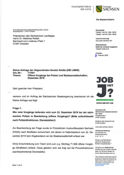"content": "STAATSI\\4 I N I STER I U I\\4 Freistaat DER JUSTIZ SACHSEN Die Staatsministerin SACHSISCHES STAATSMINISTERIUM DER JUSTIZ Durchwahl Hospitalstraße 7 |101097 Dresden Telefon +49 351 564-15000 Telefax +49 351 564-15009 Präsidenten des Sächsischen Landtages Herrn Dr. Matthias Rößler staatsministerin@ Bern hard-von-Li ndena u-Platz 1 smj.justiz.sachsen.de* 01067 Dresden Aktenzeichen (bitte bei Antwort angeben) 1040E/10/28-KLR Dresden, 3 Februar 2020 Kleine Anfrage der Abgeordneten Kerstin Köditz (DlE LINKE) Drs.-Nr.: 711041 Thema: Offene Vorgänge bei Polizei und Staatsanwaltschaften, Dezember 2019 foB MIT Sehr geehrter Herr Präsident, namens und im Auftrag der Sächsischen Staatsregierung beantworte ich die O Kleine Anfrage wie folgt: VVWW'TOB.MIT.J.DE Frage 1: Hausanschrift: Wie viele Vorgänge befanden sich zum 22. Dezember 2019 bei der säch- :::nTj*staatsministerium sischen Polizei in Bearbeitung (offene Vorgänge)? (Bitte aufschtüssetn ä,\".\"51fl]::f:\"t nach Polizeidirektionen, Dienststellen!) post 3ffi1?T,,.jffJ,.,\"eutsche wwwjustizsachsende/smj Zur Beantwortung der Frage wurde im Polizeilichen Auskunftssystem Sachsen (PASS) nach Straftaten recherchiert, bei denen im Datenbestand vom 22. De- y;'$:''.\"n\"\"\",'illlo\"\"n' zember 2019 kein Abgabedatum an die Staatsanwaltschaft erfasst war. ;:äTtTi\"'\"\" Parken und behinderten- gerechter Zugang über Ohne Einschränkung zum Tatort sind zum o.g. Stichtag 71.899 offene Vorgän- EinrahrtHospitalstraße7 ge (Straftaten) erfasst. Diese gliedern sich wie folgt auf die Polizeidirektionen :Jly_ä#:,?:f\":\",:11,\"ä,\"_ (sach bearbeitende Dienststelle) seite. Auf Wunsch senden wir lhnen diese Hinweise auch zu. .Kein Zugang für elektronisch signierte sowie für verschlüsselte elektronische Nachrichtent nähere lnformationen zur elektronischen Kommunikation mit sächsischen Justizbehörden unter lW.iustiz.sachsen.de/E- Seite 1 von 3 Kommunikation.",