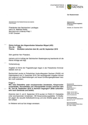 "content": "STAATSMINISTERIUM Freistaat DES 1NNERN SACH SEN Der Staatsminister SÄCHSISCHES STAATSMINISTERIUM DES INNERN Aktenzeichen 01095 Dresden (bitte bei Antwort angeben) 3-1053/89/4 Präsidenten des Sächsischen Landtages Dresden, 20. Dezember 2019 Herrn Dr. Matthias Rößler Bernhard-von-Lindenau-Platz 1 01067 Dresden Kleine Anfrage des Abgeordneten Sebastian Wippel (AfD) Drs.-Nr.: 7/655 Thema: Straftaten zwischen dem 06. und 08. September 2019 Sehr geehrter Herr Präsident, namens und im Auftrag der Sächsischen Staatsregierung beantworte ich die Kleine Anfrage wie folgt: Vorbemerkung: Angaben im Sinne der Fragestellungen liegen in der Polizeilichen Kriminal- statistik nicht vor. Recherchiert wurde im Polizeilichen Auskunfissystem Sachsen (PASS) mit Datenbestand vom 3. Dezember 2019. Die nachfolgenden Angaben können sich aufgrund von Nachmeldungen und neuen Ermittlungsergebnissen inso— fern noch verändern. Frage 1: Hausanschrift: Wie viele Diebstähle unter erschwerenden Umständen, Körperverlet- Sächsisches Staatsministerium zungsdelikte, Sexualdelikte und Tötungsdelikte wurden zwischen dem des Innern WilheIm-Buck-Str. 2 06. und 08. September 2019 in Sachsen begangen? (Bitte aufschlüs- 01097 Dresden seln nach Gemeinde und Delikt!) Telefon +49 351 564-0 Telefax +49 351 564-3199 Zwischen dem 6. und 8. September 2019 wurden im PASS 611 Diebstähle www.smi.sachsen.de unter erschwerenden Umständen, 185 Körperverletzungsdelikte, 19 Strafta- Verkehrsanbindung: ten gegen die sexuelle Selbstbestimmung und eine Straftat gegen das Le- Zu erreichen mit den Straßenbahnli- ben erfasst. nien 3,6‚7‚8‚ 13 Besucherparkplätze: Im Weiteren wird auf die Anlage verwiesen. Bitte beim Empfang WilheIm-Buck— Str. 2 oder 4 melden.",