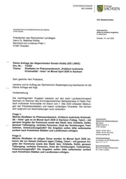 "content": "STAATSMINlSTERIUM Freistaat DES INNERN SACH SEN Der Staatsminister SÄCHSISCHES STAATSMINISTERIUM DES INNERN Aktenzeichen 01095 Dresden (bitte bei Antwort angeben) 3-1053/100/3 Präsidenten des Sächsischen Landtages Dresden, 16. Juni 2020 Herrn Dr. Matthias Rößler Bernhard-von-Lindenau-Platz 1 01067 Dresden Kleine Anfrage der Abgeordneten Kerstin Köditz (DIE LINKE) Drs.-Nr.: 7/2252 Thema: Straftaten im Phänomenbereich „Politisch motivierte Kriminalität — links“ im Monat April 2020 in Sachsen Sehr geehrter Herr Präsident, namens und im Auftrag der Sächsischen Staatsregierung beantworte ich die Kleine Anfrage wie folgt: Vorbemerkung: Die nachfolgenden Angaben basieren auf den beim Landeskriminalamt Sachsen im Rahmen des Kriminalpolizeilichen Meldedienstes in Fällen Poli- tisch motivierter Kriminalität mit Stand vom 7. Mai 2020 erfassten Meldun- gen der Polizeidienststellen und haben vorläufigen Charakter. Sie können sich aufgrund von Nachmeldungen noch verändern. Frage 1: Welche Straftaten im Phänomenbereich „Politisch motivierte Kriminali- tät — links“ gab es im Monat April 2020 in Sachsen (Tattag, Tatort — mit Hausanschrift: Sächsisches Staatsministerium genauer Angabe der Kommune sowie des Stadt- bzw. Ortsteils, Delikt, des Innern genauer Tathergang, verletzte Personen, Grad der Verletzungen, Fest- WilheIm-Buck—Str. 2 01097 Dresden nahmen, Untersuchungshaft)? Die Angaben sollen bitte seitenweise sortiert nach Kreisfreien Städten und Landkreisen erfolgen. Telefon +49 351 564-0 Telefax +49 351 564-3199 www.smi.sachsen.de F rage 2: Welche Straftaten im obigen Sinne wurden im Monat April 2020 be- Verkehrsanbindung: Zu erreichen mit den Straßenbahnli- kannt, die vor diesem Zeitraum lagen (Tattag, Tatort — mit genauer An- nien 3.6.7.8.13 gabe der Kommune sowie des Stadt- bzw. Ortsteils, Delikt, genauer Besucherparkplätze: Tathergang, verletzte Personen, Grad der Verletzungen, Festnahmen, Bitte beim Empfang WilheIm-Buck- Untersuchungshaft)? Die Angaben sollen bitte seitenweise sortiert Str. 2 oder4 melden. nach Kreisfreien Städten und Landkreisen erfolgen.",