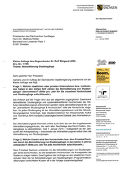 "content": "STAATSMINISTERIUM Freistaat FÜR WISSENSCHAFT SACHSEN KULTUR UND TOURISMUS Der Staatsminister STAATSMINISTERIUM FÜR WISSENSCHAFT, KULTUR UND TOURISMUS Aktenzeichen Postfach 10 09 20 I 01079 Dresden (bitte bei Antwort angeben) L-1053/6/68-2019/64372 Präsidenten des Sächsischen Landtages Dresden, Herrn Dr. Matthias Rößler 10- Januar 2020 Bernhard-von-Lindenau-Platz 1 01067 Dresden Kleine Anfrage des Abgeordneten Dr. Rolf Weigand (AfD) lllljaiUiiiiiiiill; MiUllHI INDUSTRIE. „H-iiKÜLTUn. Drs.-Nr.: 7/799 SACHSEN. Thema: Akkreditierung Studiengänge Boom. Sehr geehrter Herr Präsident, 500 Jahre Industriekultur namens und im Auftrag der Sächsischen Staatsregierung beantworte ich die in Sachsen www^joom-sochserude Kleine Anfrage wie folgt: Frage 1: Welche staatlichen oder privaten Unternehmen bzw. Institutio nen haben in den letzten fünf Jahren die Akkreditierung von Studien gängen übernommen? (Bitte pro Jahr für die einzelnen Hochschulen und Studiengänge aufschlüsseln.) Zertifikat seit 2007 audK befufundfamitig^ Die Antwort auf die Frage kann aus der allgemein zugänglichen Datenbank akkreditierter Studiengänge und systemakkreditierter Hochschulen der Stif tung Akkreditierungsrat entnommen werden (www.akkreditierungsrat.de; un Hausanschrift: ter „akkreditierte Studiengänge & Hochschulen\" bitte die Hochschule einge Staatsministerium für ben: für jeden Studiengang ist der Akkreditierungszeitraum und die Akkredi Wissenschaft, Kultur und Tourismus tierungsagentur hinterlegt). Das Staatsministerium für Wissenschaft, Kultur WIgardstraße 17 und Tourismus führt mangels Zuständigkeit keine Statistik über Akkreditierun 01097 Dresden gen. Staatsministerin für Kultur und Tourismus Der Akkreditierungsrat informiert online auch über die von ihm zugelassenen Königsbrücker Straße 21-29 01099 Dresden Akkreditierungsagenturen, die nach alter Rechtslage das Recht hatten, Stu diengänge zu akkreditieren. Seit 1. Januar 2018 - maßgeblich ist der Zeit www.smwk.sachsen.de punkt der Antragstellung - entscheidet der Akkreditierungsrat selbst über die Verkehrsanbindung: Akkreditierung von Studiengängen. Zu erreichen mit den Straßenbahnli nien 3, 6, 7, 8, 13 Frage 2: Welche Kosten sind den Hochschulen bzw. dem Freistaat Sach Für Besucher mit Behinderungen sen durch die Akkreditierung von Studiengängen in den letzten 5 Jahren befinden sich gekennzeichnete entstanden? (Bitte pro Jahr für jede Hochschule aufschlüsseln.) Parkplätze am Hintereingang der WIgardstraße 17. Für alle Besu cherparkplätze gilt: Bitte beim Pfor Dem Freistaat Sachsen entstehen für die Akkreditierungen von Studiengän tendienst melden. gen direkt keine Kosten, da die staatlichen Hochschulen als Antragsteller die * Der Empfang von elektronisch signierten und verschlüsselten Dokumenten ist mög Kosten zu tragen haben. Das Ergebnis der Umfrage an den staatlichen Hoch lich. schulen über die für Akkreditierungen von Studiengängen (Programmakkre De-Maii: ditierungen) entrichteten Kosten ist in der Anlage zusammengefasst. ministerlum@smwk-sachsen.de-mait.de",