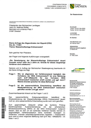 "content": "STAATSI\\4INISTERIUM FÜR ENERGIE, KLINIASCHUTZ, UMWELT UND LANDWIRTSCHAFT 5 Freistaat SACHSEN Rahmen einer Kleinen Anfrage getroffen werden Die endgültige Entscheidung über die Befreiung nach $ 67 Abs. 1 BNatSchG wird erst mit Abschluss des Verfahrens zur WKA Erdmannsdorf erfolgen. Frage 3: Inwiefern spricht vor dem Hintergrund des in S 261 BNatSchG umfassten Natur- und Lebensraumschutzes nicht bereits in der Abwägung zum Landschaftsschutz die Verschlechterung des Gewässers für die aquatischen Lebensformen durchgreifend gegen die Befreiung von Landschaftsschutzvorgaben und wie ist eine landschaftsschutzrechtliche Befreiung nach S 67 I BNatschG in Anbetracht der Schutzzwecke und Handlungsverbote in SS 3, 4 der Verordnung des LRA Mittelsachsen zut Festsetzung des Landschaftsschutzgebietes ,,Augustusburg-Sternmühlental\" vom 10.1 1 .2010 zu rechtfertigen. Die Abwägung der Belange des Landschaftsschutzgebietes ,,Augustusburg- Sternmühlental\" sowie eventuelle Befreiungen von den Landschaftsschutzvorgaben erfolgen im Rahmen des laufenden Wasserrechtsverfahrens. Aussagen zu entscheidungsrelevanten Aspekten sind wegen des noch nicht abgeschlossenen Verfahrens nicht möglich. Frage 4: Welche Gründe des überwiegenden öffentlichen lnteresses oder unzumutbaren Belastungen i. S. d. S 67 I BNatSchG werden vom zuständigen LRA gesehen, die in der Abwägung zur Rechtfertigung zu einer Befreiung von Vorgaben des Landschaftsschutzgebietes führen könnten? Frage 5: Welche Gründe liegen vor, dass die Entscheidung über die wasserrechtliche Genehmigung und die einhergehende finale Abwägung über eine landschaftsschutzrechtliche Befreiung immer noch nicht öffentlich bekannt ist? Welche konkreten Punkte werden im derzeitigen Verfahrensstand von behördlicher Seite konkret noch ermittelt bzw. rechtlich geprüft? Zusammenfassende Antwort auf die Fragen 4 und 5: Die Ermittlung und Abwägung der Gründe des übenruiegenden öffentlichen lnteresses erfolgt im Rahmen des aktuell laufenden wasserrechtlichen Zulassungsverfahrens durch die zuständige Wasserbehörde. Da das Wasserrechtsverfahren noch nicht abgeschlossen ist, sind zu verfahrens- oder entscheidungsrelevanten Aspekten keine Aussagen möglich. Mit freund Grü ßen Wolfram G er Seite 2 von 2",