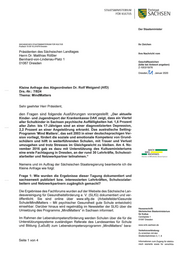 "content": "~ SACHsEN STAATSMINISTERIUM FÜR KULTUS Der Staatsminister SÄCHSISCHES STAATSMINISTERIUM FÜR KULTUS Ihr Zeichen Postfach 1O 09 1O 1 01079 Dresden Präsidenten des Sächsischen Landtages Ihre Nachricht vom Herrn Dr. Matthias Rößler Bernhard-von-Lindenau-Platz 1 Geschäftszeichen 01067 Dresden (bitte bei Antwort angeben) Z-1053/19/76 Dresden,'Z/t . Januar 2020 Kleine Anfrage des Abgeordneten Dr. Rolf Weigand (AfD) Drs.-Nr.: 7/824 Thema: MindMatters Sehr geehrter Herr Präsident, den Fragen sind folgende Ausführungen vorangestellt: „Der aktuelle Kinder- und Jugendreport der Krankenkasse DAK zeigt, dass ein Viertel aller Schulkinder in Sachsen psychische Auffälligkeiten hat. 1,6 Prozent aller Zehn- bis 17-Jährigen sind an einer diagnostizierten Depression, 2,2 Prozent an einer Angststörung erkrankt. Das australische Setting- Programm 'Mind Matters', das seit 2003 in einer deutschsprachigen Ver- sion vorliegt, fördert die soziale und emotionale Kompetenz von Grund- schülern und hilft in weiterführenden Schulen, mit Trauer und Verlust umzugehen und trotz Stresses im Gleichgewicht zu bleiben. Am 4. No- vember 2016 gab es dazu mit Unterstützung des Kultusministeriums MACH _ __ eine erste Fachtagung in Dresden, an der rund 30 Lehrkräfte, Schulsozi- - WAS WICHTIG ES alarbeiter und Netzwerkpartner teilnahmen.\" A1br1 1tn 1m Öffrn lhchrn D1rm1 Sach\\t n Namens und im Auftrag der Sächsischen Staatsregierung beantworte ich die Kleine Anfrage wie folgt: Frage 1: Wie wurden die Ergebnisse dieser Tagung dokumentiert und sachsenweit publiziert bzw. interessierten Lehrkräften, Schulsozialar- beitern und Netzwerkpartnern zugänglich gemacht? Die Ergebnisse des Fachforums wurden auf der Website des Sächsische Lan- desvereinigung für Gesundheitsförderung e. V. (SUG) dokumentiert und ver- öffentlicht. Sie sind online über www.slfg.de (Arbeitsfelder\\Gesunde Schule\\MindMatters - Mit psychischer Gesundheit gute Schule entwickeln) einsehbar. Darüber hinaus wird regelmäßig im Newsletter der SUG über die Hausanschrift: Umsetzung des Programms „MindMatters\" in Sachsen informiert. Sächsisches Staatsministerium für Kultus Carolaplatz 1 Im Rahmen der Lebenskompetenzförderung werden Schulen über die für die 01097 Dresden Unterstützungssysteme zuständigen Referate des Landesamtes für Schule www.smk.sachsen.de und Bildung (LaSuB) zum Lebenskompetenzprogramm „MindMatters\" bera- Verkehrsverbindung : Zu erreichen mit den Straßenbahnlinien 3. 7. 8 Seite 1 von 4 Informationen zum Zugang für elektro- nisch siqnierte sowie für verschlüs-",