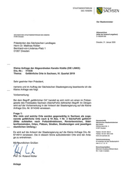 "content": "STAATSNIiNiSTERiUM Freistaat DES iNNERN SACHSEN Der Staatsminister Aktenzeichen SÄCHSISCHES STAATSMINISTERIUM DES INNERN (bitte bei Antwort angeben) 01095 Dresden 3-1053/91/30 Dresden, 31. Januar 2020 Präsidenten des Sächsischen Landtages Herrn Dr. Matthias Rößler Bernhard-von-Lindenau-Platz 1 01067 Dresden Kleine Anfrage der Abgeordneten Kerstin Köditz (DIE LINKE) Drs.-Nr.: 7I1035 Thema: Gefährliche Orte in Sachsen, IV. Quartal 2019 Sehr geehrter Herr Präsident, namens und im Auftrag der Sächsischen Staatsregierung beantworte ich die Kleine Anfrage wie folgt: Vorbemerkung: Bei dem Begriff „gefährlicher Ort\" handelt es sich nicht um einen im Polizei- gesetz des Freistaates Sachsen (SächsPoIG) definierten Begriff. Im Übrigen wird auf die Vorbemerkung in der Antwort der Staatsregierung auf die Kleine Anfrage Drs.-Nr. 6/14349 verwiesen. Frage 1: Wie viele und welche Orte werden gegenwärtig in Sachsen als soge- nannte gefährliche Orte nach § 19 Abs. 1 Nr. 2 SächsPolG geführt? Hausanschrift: (Bitte aufstellen nach Polizeidirektionen, Revierbereichen, Städ- Sächsisches Staatsministerium teanemeinden, Orten, Plätzen, Straßen, Straßenzügen und jeweiligen des Innern Wiihelm-Buck—Str. 2 räumlichen Umfang.) 01097 Dresden Es wird auf die Antwort der Staatsregierung auf die Kleine Anfrage Drs.-Nr. Telefon +49 351 564-0 Telefax +49 351 564-3199 6/14914 verwiesen. Die in diesem Sinne aufzulistenden Orte sind der Anla- www.smi.sachsen.de ge zu entnehmen. Verkehrsanbindung: Zu erreichen mit den Straßenbahnli- Mi undlichen Grüßen nien 3, 6, 7, 8, 13 J „A Besucherparkplätze: Bitte beim Empfang Wilhelm—Buck- Str. 2 oder4 meiden. o . Dr. Roland Wölier Anlage",