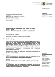 "content": "STAATSMINISTERIUM Freistaat DES INNERN SACH SEN Der Staatsminister Aktenzeichen SÄCHSISCHES STAATSMINISTERIUM DES INNERN (bitte bei Antwort angeben) 01095 Dresden 3-1053/85/65 Präsidenten des Sächsischen Landtages Dresden. 13. November 2019 Herrn Dr. Matthias Rößler Bernhard-von-Lindenau-Platz 1 01067 Dresden Kleine Anfrage des Abgeordneten Franz Sodann (Die LINKE) Drs.-Nr.: 7/219 Thema: Polizeieinsatz am 23. Juni 2019 in Leipzig Mockau Sehr geehrter Herr Präsident, den Fragen sind folgende Ausführungen vorangestellt: „Vorbemerkung: In der Nacht von Samstag zu Sonntag verprügeln gegen 3 Uhr mehrere Rechte an der Ecke OelßnerstraßeNVilhelm-Busch-Straße in Leipzig Mockau eine schwarze Person. Als die Polizei kommt rufen die Täter laut ‚Sieg Heil‘ und ‚Heil Hitler‘ sowie weitere rechte Parolen. Da die Täter scheinbar nicht von der Polizei in Gewahrsam genommen wer- den können sie ungestört weiter neonazistische Parolen grölen und Anwohner_innen bedrohen.“ (Veröffentlicht auf chronik.LE: https:/lwww.chronikle.org) Namens und im Auftrag der Sächsischen Staatsregierung beantworte ich die Kleine Anfrage wie folgt: Hausanschrift: Sächsisches Staatsministerium Frage 1: des Innern Welche Erkenntnisse und Informationen liegen der Staatsregierung zu VWhelm-Buck-Str. 2 01097 Dresden dem in der Vorbemerkung beschriebenen Einsatz vor? Telefon +49 351 564-0 Telefax +49 351 564-3199 Frage 2: www.smi.sachsen.de Wie stellt sich der Sachverhalt aus Sicht der Staatsregierung dar? Verkehrsanbindung: Zu erreichen mit den Straßen- Frage 3: bahnlinien 3, 6, 7, 8. 13 Ist es zutreffend, dass die eingesetzten Polizeikräfte, das Rufen von Besucherparkplätze: Parolen und die Bedrohung von Anwohnern nicht unterbunden haben Bitte beim Empfang Wilhelm- und wenn ja, warum wurde dieses nicht getan? Buck-Str. 2 oder 4 melden.",
