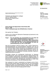 "content": "Der Staatsminister Sächsisches Staatsministerium für Wirtschaft, Arbeit und Verkehr Durchwahl Postfach 10 03 29 | 01073 Dresden Telefon: 0351 564-80001 Telefax: 0351 564-80080 Präsidenten des Sächsischen Landtages Aktenzeichen (bitte bei Antwort angeben) Herrn Dr. Matthias Rößler PKL-1053/87/2-2019/62793 Bernhard-von-Lindenau-Platz 1 Dresden, 14. November 2019 01067 Dresden Kleine Anfrage des Abgeordneten André Wendt (AfD) Drs.-Nr.: 7/283 Thema: Ausbauplanungen des 5G-Mobilfunkes in Sachsen Sehr geehrter Herr Präsident, namens und im Auftrag der Sächsischen Staatsregierung beantworte ich die Kleine Anfrage wie folgt: Frage 1: Wo wird derzeitig und voraussichtlich bis zum Ende des Jahres 2020 ein 5G-Mobilfunksender eingerichtet? (Bitte nach Standorten aufschlüsseln, dabei unterscheiden zwischen Sendeanlagen mit einer Gesamtsendeleistung von 10 Watt EIRP oder mehr und Sendeanlagen mit einer Ge- samtsendeleistung von unter 10 Watt EIRP.) Nach dem Grundgesetz, Artikel 87f, Absatz 2, Satz 1 werden Telekommuni- kationsdienstleistungen als privatwirtschaftliche Tätigkeiten durch die aus dem Sondervermögen Deutsche Bundespost hervorgegangenen Unterneh- men und durch andere private Anbieter eigenverantwortlich erbracht. Ge- Hausanschrift naue Standorte sowie die unternehmensinternen Planungen sind als Ge- Sächsisches Staatsministerium schäftsgeheimnisse der im Wettbewerb zueinander stehenden Telekommu- für Wirtschaft, Arbeit und Verkehr nikationsunternehmen anzusehen. Wilhelm-Buck-Straße 2 01097 Dresden Demzufolge umfassen die nachfolgenden Ausführungen nur diejenigen 5G-Mobilfunksender, welche direkt durch sächsische Staatsministerien oder Außenstelle deren unmittelbar nachgeordneten Geschäftsbereich aufgebaut werden. Zu Ammonstraße 10 01069 Dresden berücksichtigen ist hier jedoch, dass damit kein kommerzieller Netzbetrieb im Sinne des o.g. Artikel 87f des Grundgesetzes verbunden ist, sondern dass Forschung und Erprobung im Fokus des Netzbetriebs stehen. www.smwa.sachsen.de Das Landesamt für Umwelt, Landwirtschaft und Geologie und die Techni- Verkehrsanbindung: sche Universität Dresden planen am Standort des Lehr- und Versuchsgutes Zu erreichen mit den Straßenbahnlinien Köllitsch den Aufbau von 5G-Basisstationen bis Ende 2020, die im landwirt- 3, 7, 8, 9 - Haltestelle Carolaplatz schaftlichen Bereich Erprobungen durchführen werden. Über die Sendeleis- * Information zum Zugang für ver- tungen kann derzeit noch keine Aussage getroffen werden. schlüsselte elektronische Dokumente unter www.smwa.sachsen.de/kontakt.htm poststelle@smwa-sachsen. Seite 1 von 2 de-mail.de",