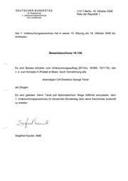 "content": "DEUTSCHER BUNDESTAG 11011 Berlin, 19. Oktober 2006 16. Wahlperiode 1. Untersuchungsausschuss Platz der Republik 1 - Der Vorsitzende - Der 1. Untersuchungsausschuss hat in seiner 15. Sitzung am 19. Oktober 2006 be- schlossen: Beweisbeschluss 16-156 Es wird Beweis erhoben zum Untersuchungsauftrag (BT-Drs. 16/990, 16/1179), hier v. a. zum Komplex II./Khaled el-Masri, durch Vernehmung des ehemaligen CIA-Direktors George Tenet als Zeugen. Es wird gebeten, Herrn Tenet auf diplomatischem Wege höflichst einzuladen, dem 1. Untersuchungsausschuss im Deutschen Bundestag über seine Kenntnisse Auskunft zu erteilen. Siegfried Kauder, MdB",