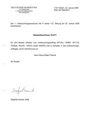"content": "DEUTSCHER BUNDESTAG 11011 Berlin, 23. Januar 2008 16. Wahlperiode 1. Untersuchungsausschuss Platz der Republik 1 - Der Vorsitzende - Der 1. Untersuchungsausschuss hat in seiner 112. Sitzung am 22. Januar 2009 beschlossen: Beweisbeschluss 16-471 Es wird Beweis erhoben zum Untersuchungsauftrag (BT-Drs. 16/990, 16/1179, 16/3028, 16/3191, 16/5751 sowie 16/6007), hier zu Komplex V. des Untersuchungs- auftrages, durch Vernehmung von Herrn Klaus-Dieter Fritsche als Zeugen. Siegfried Kauder, MdB",