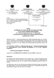 "content": "Ute Vogt Dorothee Menzner Sylvia Kotting-Uhl Mitglied des Deutschen Bundestages Mitglied des Deutschen Bundestages Mitglied des Deutschen Bundestages Obfrau , Obfrau Obfrau der SPD-Bundestagsfraktion der Fraktion DIE LINKE der Fraktion BÜNDNIS 90/DIE GRÜNEN im 1. Untersuchungsausschuss im 1. Untersuchungsausschuss im 1. Untersuchungsausschuss der 17. Wahlperiode der 17. Wahlperiode der 17. Wahlperiode Deutscher Bundestag 1. Untersuchungsausschuss der 17. Wahlperiode An die Vorsitzende des 1. Untersuchungsausschusses Ausschussdrucksache der 17. Wahlperiode des Deutschen Bundestages 17/2 78 Frau Dr. Maria Flachsbarth, MdB · Platz der Republik 1 11011 Berlin 22. März 2012 Antrag der Mitglieder der Fraktion der SPD, der Fraktion DIE LINKE und der Fraktion BÜNDNIS 90/DIE GRÜNEN im 1. Untersuchungsausschuss der 17. Wahlperiode auf Einberufung einer Sitzung des Untersuchungsausschusses gemäß § 8 Abs. 2 PUAG Nachdem die dem 1. Untersuchungsausschuss erteilte Dauergenehmigung zur Durchfüh- rung von Sitzungen an Donnerstagen in Sitzungswochen nach wie vor Geltung hat, so dass dadurch der 29. März 2012 als möglicher Sitzungstermin des Ausschusses innerhalb des Zeitplans anzusehen ist, an dem bislang keine Ausschusssitzung einberufen wurde, wird beantragt, gemäß § 8 Abs. 2 PUAG eine öffentliche Sitzung des 1. Untersuchungsausschusses zum nächstmöglichen Termin innerhalb des Zeitplans mit dem einzigen Tagesord- nungspunkt \"Vernehmung des Zeugen Dr. Paul Krull\", möglichst für den 29. März 2012 um 10.00 Uhr, hilfsweise 15Uhr, einzuberufen. Begründung: Der Beschluss der Koalitionsmehrheit in der 75. Sitzung des 1. Untersuchungsausschusses, die Vernehmungen bis zum 26.04.2012 auszusetzen, widerspricht der Verpflichtung des Untersuchungsausschusses, den ihm erteilten Untersuchungsauftrag möglichst effektiv zu erfüllen. Die Begründung, dass für die Vernehmung der bereits terminierten Zeugen die Durchsicht neu angekündigter 14 Aktenordner des BMWi notwendig sei, ist insbesondere bezüglich der beschlossenen Zeugen Krull und Kreusch nicht tragbar.",